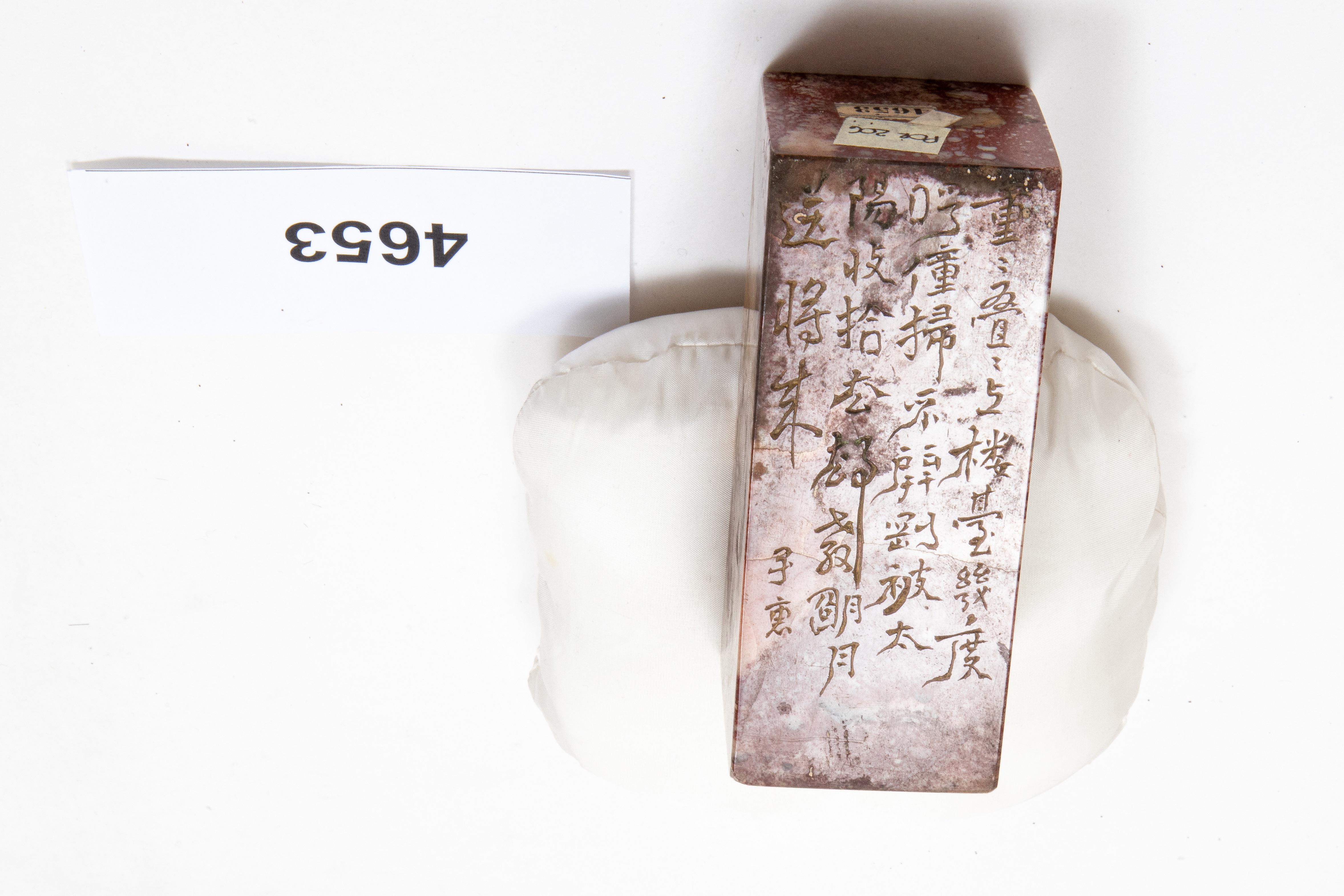 Sigillo a base quadrata in marmo rosso con screziature bianche di manifattura cinese, inciso su un lato con un'iscrizione in cinese