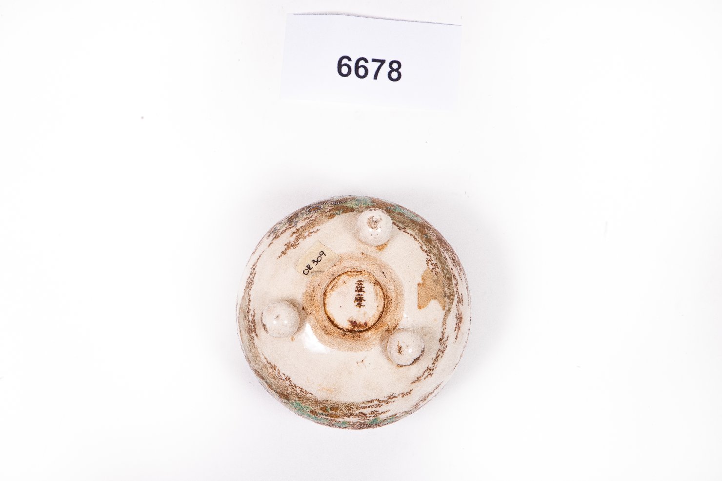 Incensiere (koro) di porcellana policroma in stile Satsuma. Si tratta di un piccolo tripode con piedi globulari, con bocca e collo stretti e due aperture sul ventre (una a forma di zucca-fiasco “hyōtan”). Sulla parte esterna, ci sono due foglie di paulownia in rilievo. Il corpo è bianco, ma la sua superficie è densamente decorata con motivi floreali – peonie, pruni e crisantemi– in smalto dorato