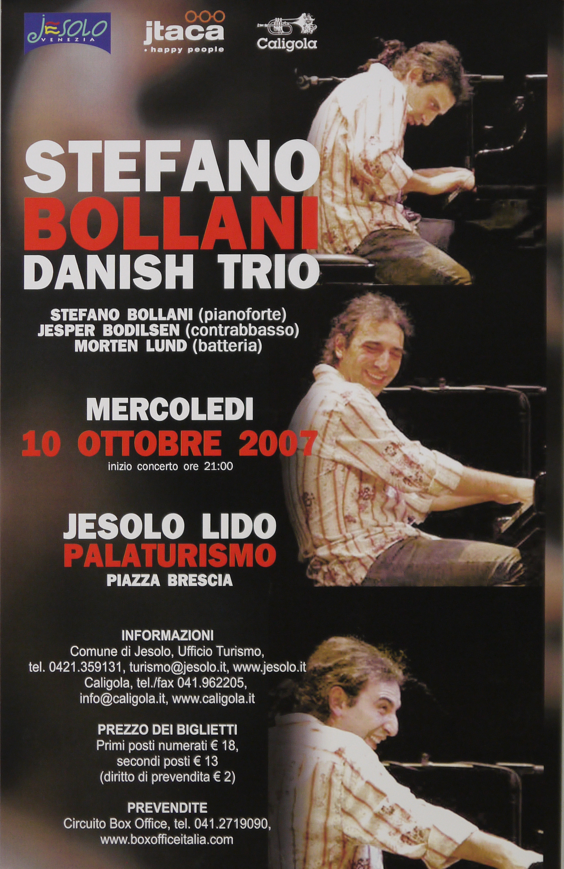 Lettura iconografica: figura maschile; uomo; musicista; pianista; compositore; pianoforte. Categoria merceologica/tipo evento: tempo libero; musica; concerto; musica jazz; amministrazione pubblica; enti locali; amministrazione comunale; turismo; associazioni di promozione turistica. Nomi: Stefano Bollani; Danish Trio; Jesper Bodilsen; Morten Lund; Jesolo Lido; Palazzo del Turismo; Comune di Jesolo; Itaca; Caligola. Luoghi: Jesolo; Venezia; Regione Veneto