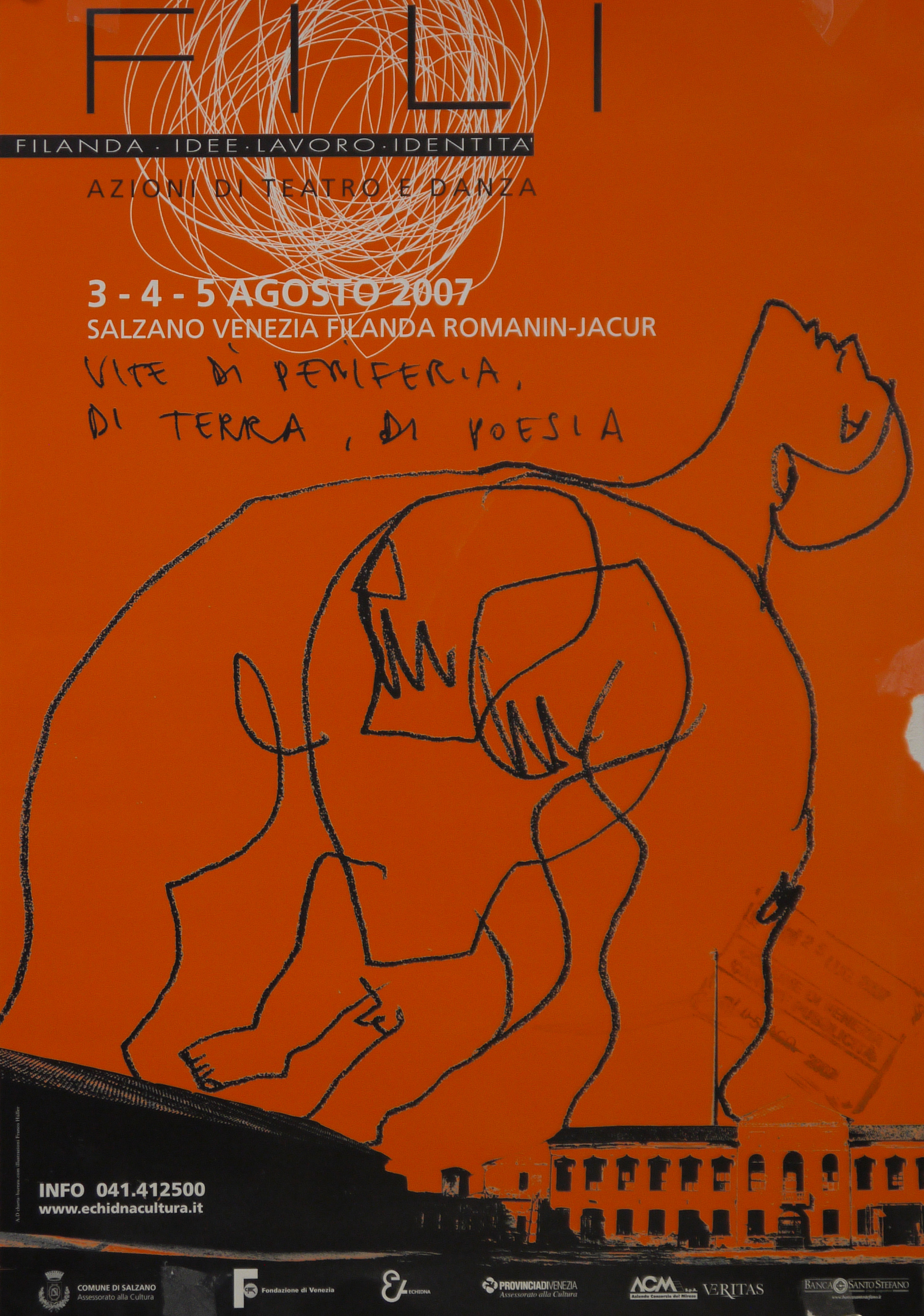 Lettura iconografica: figura umana; danzatore; architettura. Categoria merceologica/tipo evento: spettacolo; teatro; danza; periferia; manifestazioni culturali; rassegne; festival; associazioni culturali; istruzione; università; amministrazione pubblica; amministrazione centrale; amministrazione comunale; amministrazione provinciale; istituti bancarie; banca. Nomi: Fili; Idee; Lavoro; Identità; Azioni di teatro e danza; Filanda Romanin-Jacur; Vite di periferia, di terra, di poesia; Franco Hüller; Echidna Cultura; Comune di Salzano; Assessorato alla Cultura; Fondazione di Venezia; Comune di Venezia; Provincia di Venezia;ACM; Azienda Consorzio del Mirese; Veritas; Banca Santo Stefano. Luoghi: Salzano; Venezia; Regione Veneto