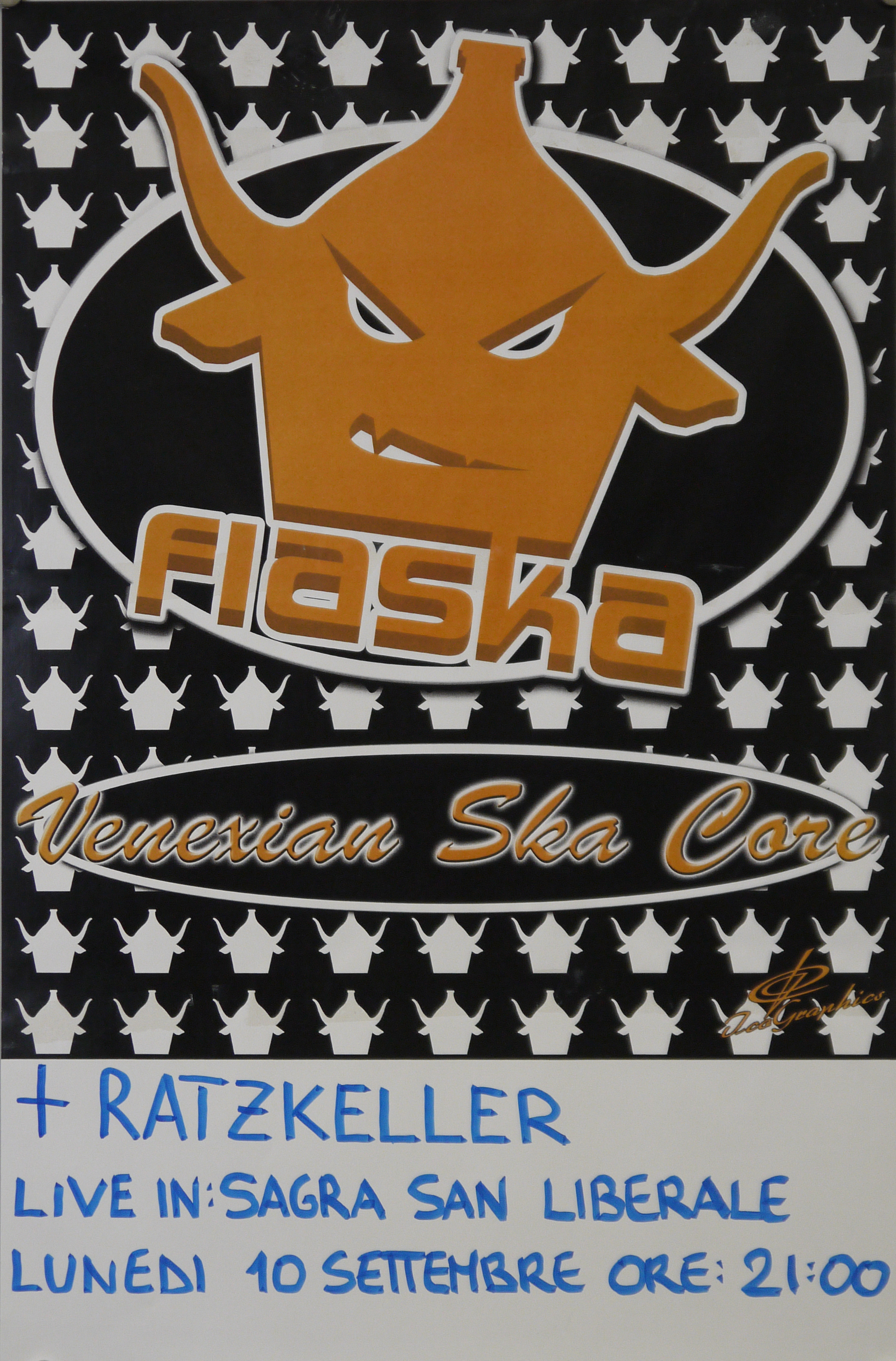 Lettura iconografica: motivo con fiasche ripetute; fiasca con occhi e bocca. Categoria merceologica/tipo evento: tempo libero; spettacolo; musica; concerto; ska. Nomi: Fiaska; Venexian Ska Core; Ratzkeller; Ico Graphics; Sagra San Liberale. Luoghi: San Liberale; Marcon; Venezia; Regione Veneto