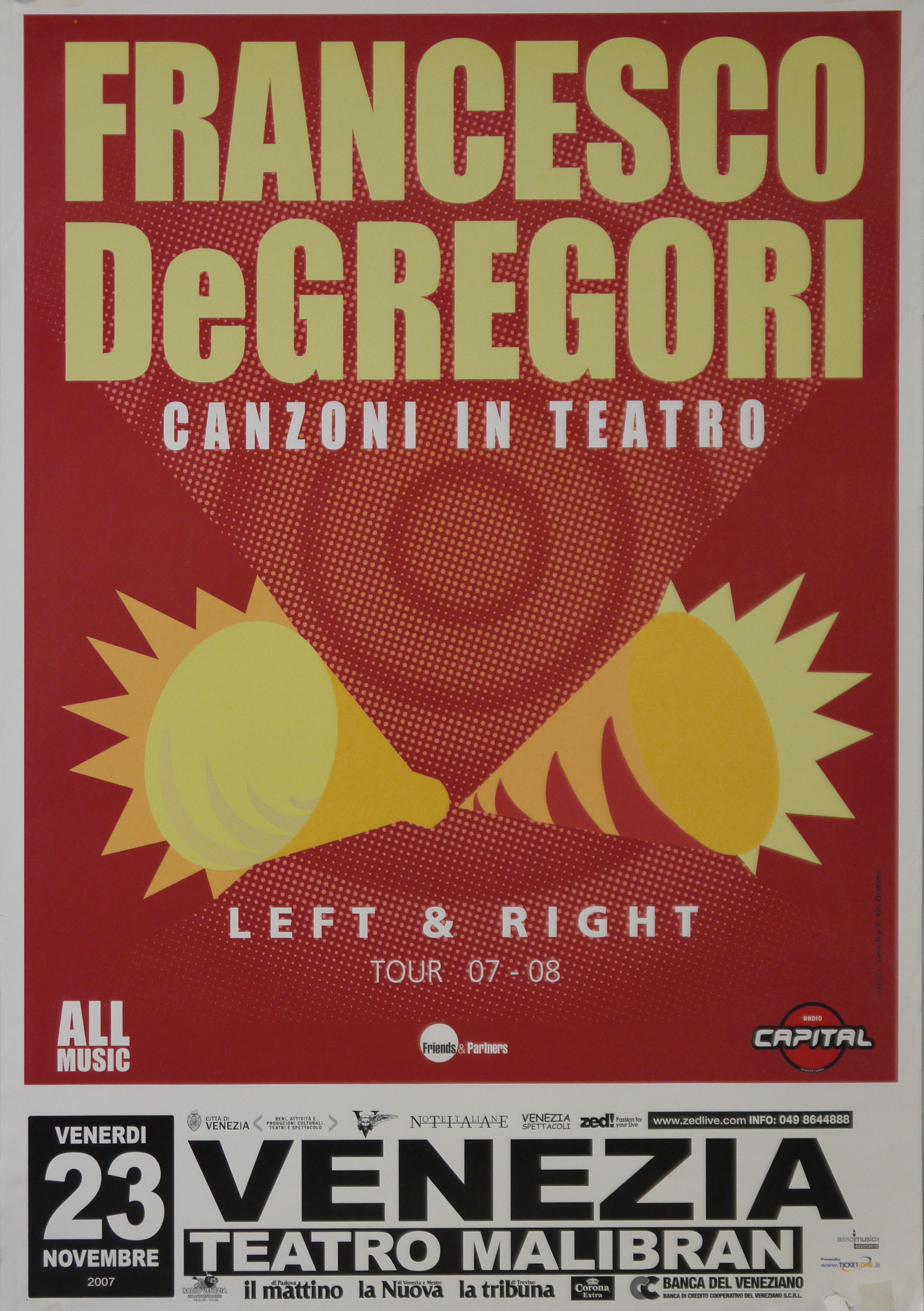 Lettura iconografica: motivo astratto. Categoria merceologica/tipo evento: spettacolo; teatro; concerto; musica leggera; cantautore; musicista; organizzazione di concerti; musica live; amministrazione pubblica; enti locali; amministrazione comunale; associazioni culturali; emittente radiofonica; servizi bancari e finanziari; banca; birra; editoria; quotidiano. Nomi: Francesco De Gregori; Canzoni in Teatro; Left & Right Tour 07-08; All Music; Friends & Partners; Radio Capital; Teatro Malibran; Città di Venezia Beni, Attività e Produzioni Culturali, Teatro e Spettacolo; NoteItaliane; Venezia Spettacoli; Zed!; Ticketone; Assomusica; Radio Venezia; il mattino di Padova; la Nuova Venezia e Mestre; la tribuna di Treviso; Corona Extra; Banca del Veneziano Banca di Creedito Cooperativo del Veneziano s.c.r.l. Luoghi: Venezia; Regione Veneto