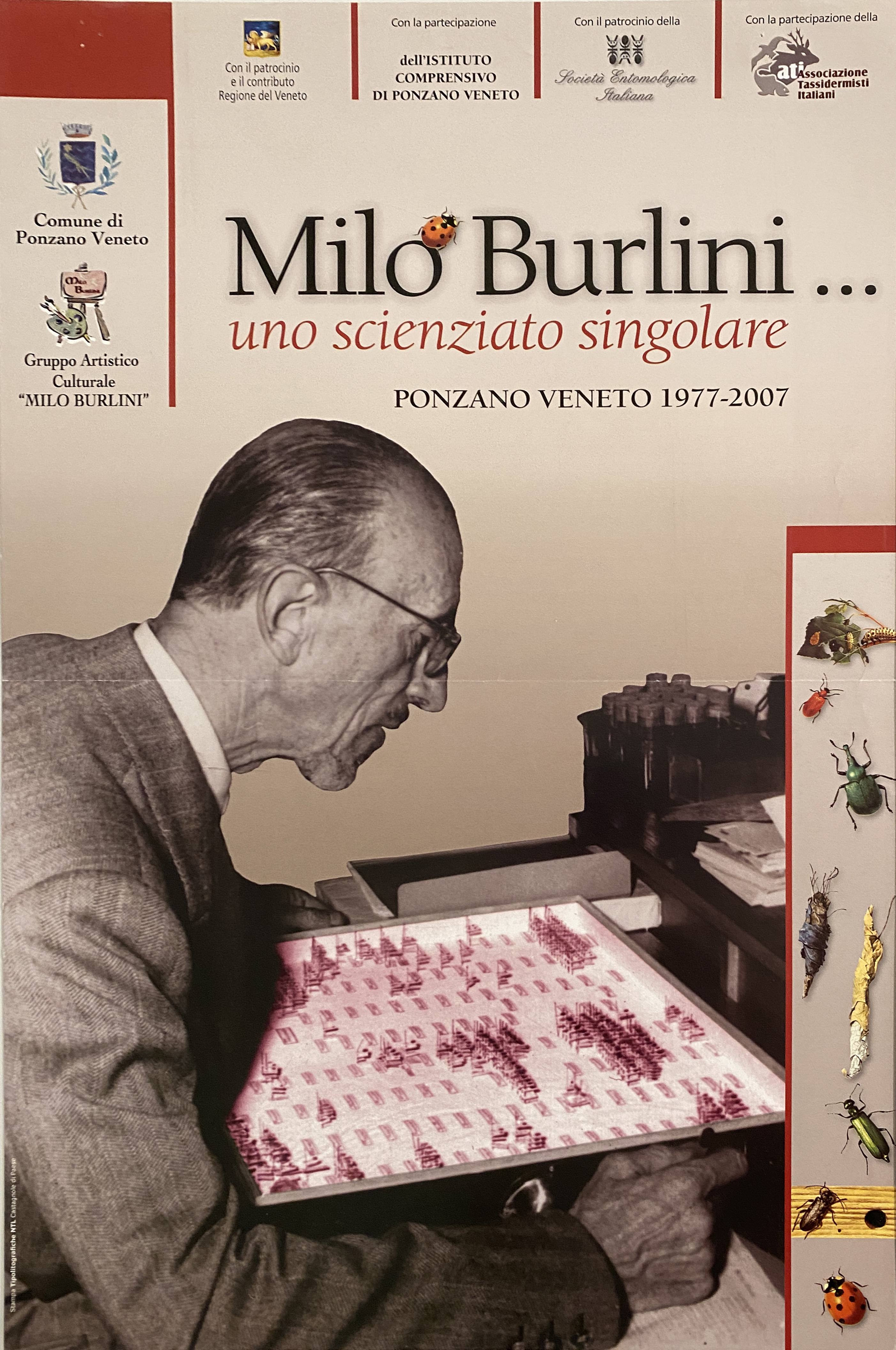 Lettura iconografica: riproduzione di fotografia; ritratto; figura maschile; uomo. Oggetti: occhiali; tavolo; libri. Animali: insetti; coccinella. Categoria merceologica/tipo evento: tempo libero; conferenze; trentennale; studi scientifici; entomologia; tassidermia; studi entomologici; associazioni culturali; eventi con patrocinio e contributo regionale; istruzione e formazione. Nomi: Milo Burlini; Gruppo Artistico Culturale "Milo Burlini"; Comune di Ponzano Veneto; Regione del Veneto; Istituto comprensivo di Ponzano Veneto; Società Entomologica Italiana; Associazione Tassidermisti Italiani; Tipolitografiche NTL. Luoghi: Ponzano Veneto; Treviso; Veneto