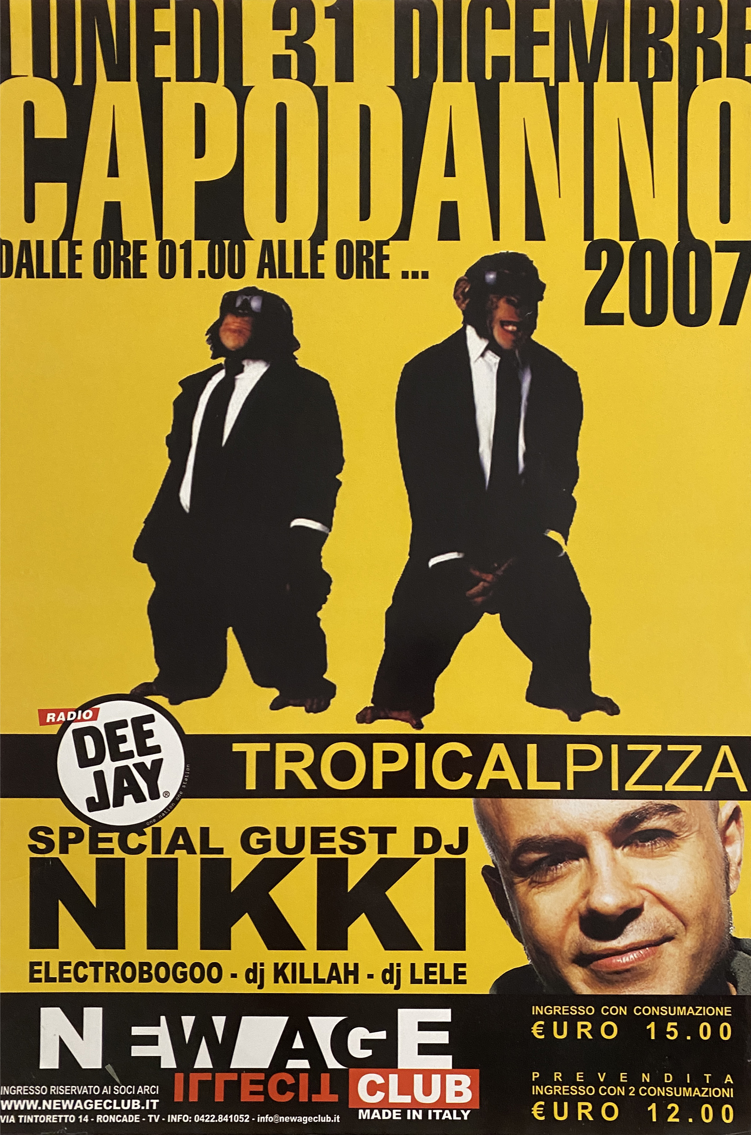 - ISCRIZIONI in alto; in basso - LUNEDI 31 DICEMBRE/ CAPODANNO 2007/ DALLE ORE 01.00 ALLE ORE...// RADIO DEEJAY TROPICALPIZZA/ SPECIAL GUEST DJ/ NIKKI/ ELECTROBOGOO - dj KILLAH - dj LELE - stampatello, corsivo minuscolo, numeri arabi -