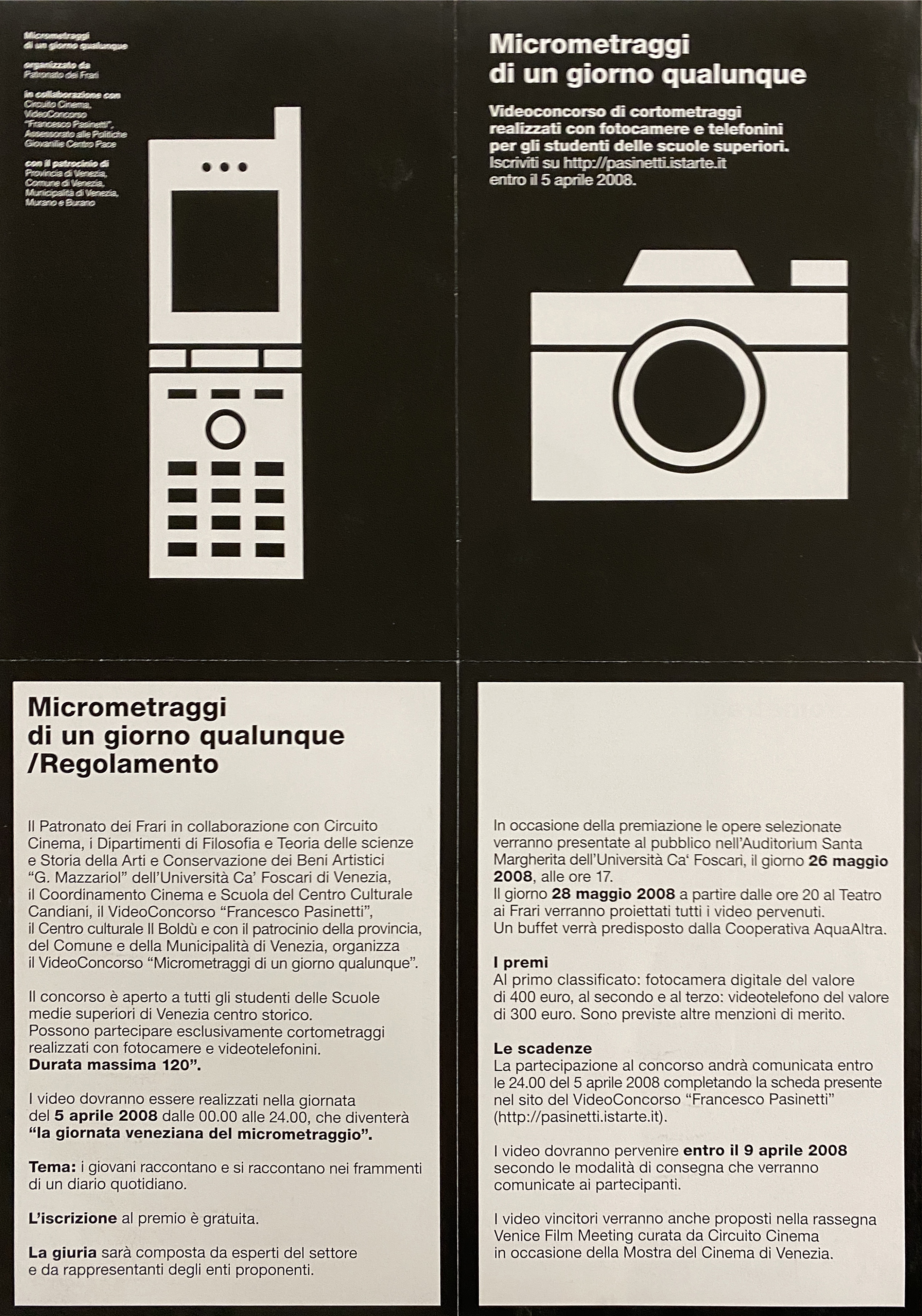 Lettura iconografica: riproduzione di fotografia. Parti del corpo: mano; testa, busto. Oggetti: sagome in cartone di telefono cellulare e macchina fotografica; telefonino; fotocamera. Categoria merceologica/ tipo evento: concorso; iniziative per gli studenti delle scuole secondarie di secondo grado; videoarte; cortometraggi; istruzione e formazione; amministrazione comunale; amministrazione provinciale. Nomi: videoconcorso; cortometraggi; scuole superiori; Francesco Pasinetti; Patronato dei Frari; Circuito Cinema Venezia&Mestre; Assessorato alle politiche giovanili e Centro Pace; Provincia di Venezia; Istituto Statale d’Arte. Luoghi: Venezia; Veneto