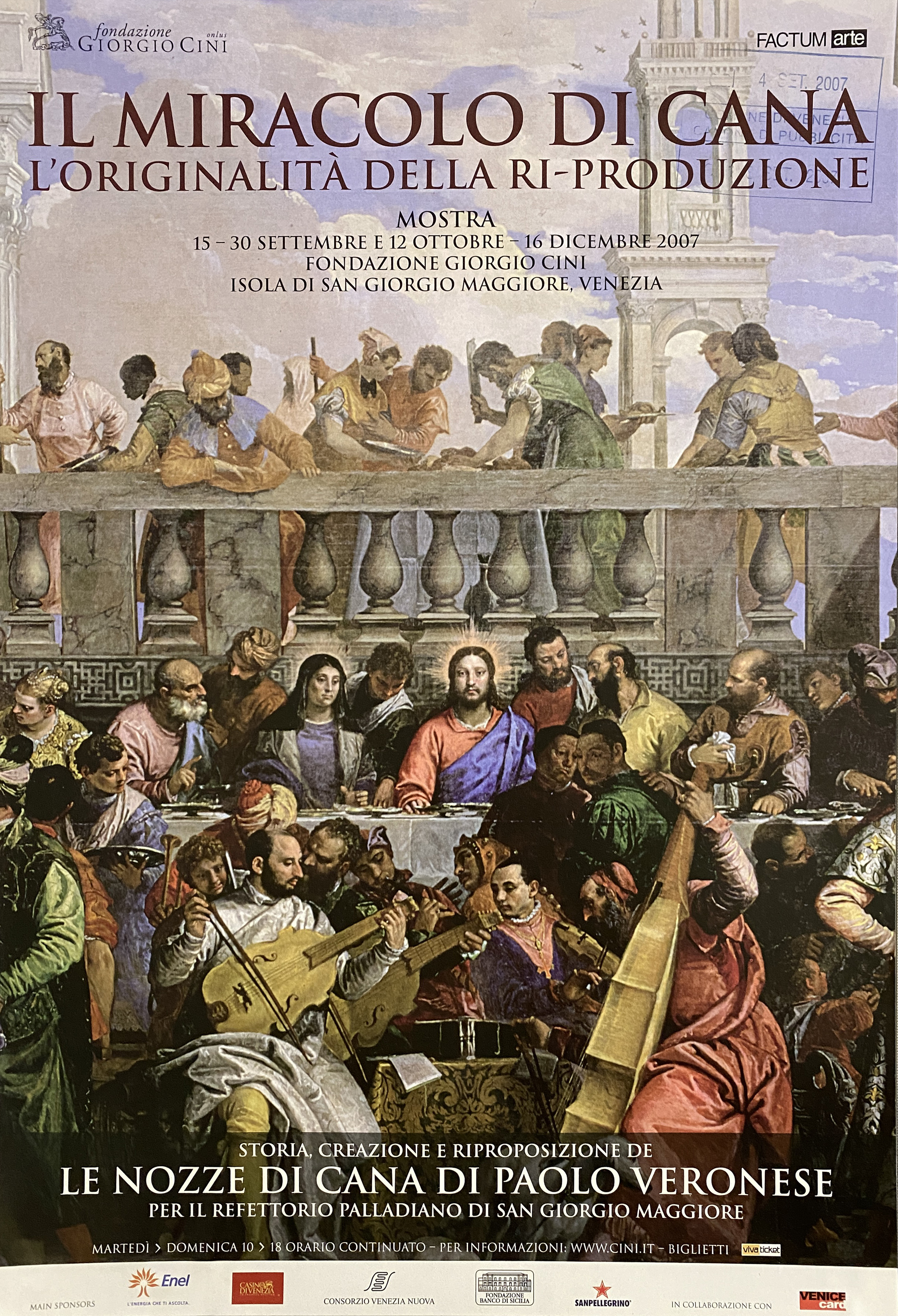 Lettura iconografica: riproduzione fotografica di dipinto; Bibbia; Storie del Nuovo Testamento; vita pubblica di Cristo: dal battesimo alla Passione; miracoli legati ai pasti; festa di nozze a Cana. Categoria merceologica/tipo evento: manifestazioni culturali; mostre; mostra d'arte; istituzioni culturali; organizzazione non lucrativa di utilità sociale; fondazione; conservazione del patrimonio culturale; riproduzione digitale dell'opera d'arte; innovazione digitale. Nomi: Paolo Veronese; Andrea Palladio; Fondazione Giorgio Cini; Factum Arte; Adam Lowe. Luoghi: Venezia; Isola di San Giorgio Maggiore; Regione Veneto