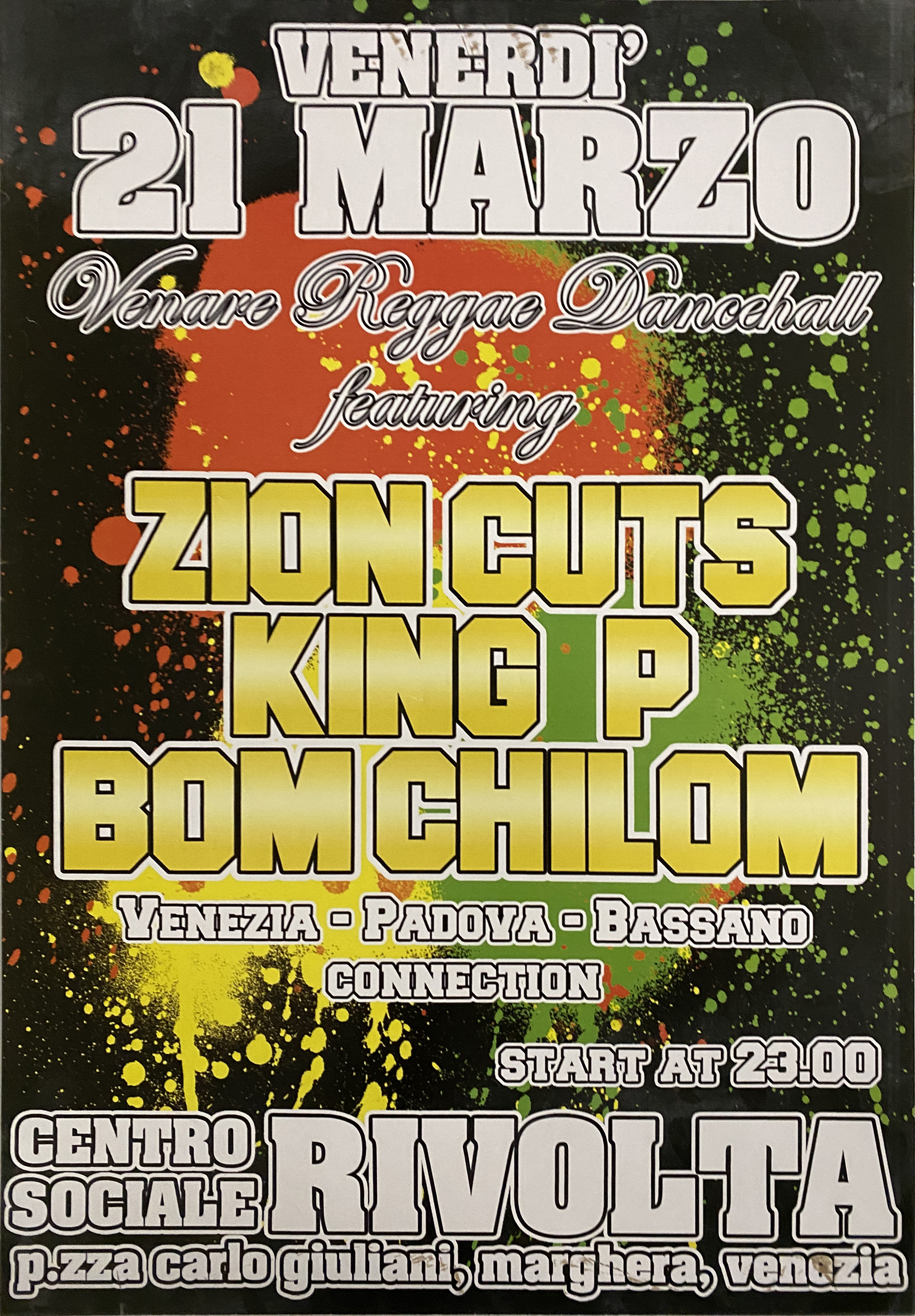 Lettura iconografica: grafica; motivo astratto con macchie di colore; verde; giallo; rosso. Categoria merceologica/tipo evento: tempo libero; centro sociale; musica reggae; concerto; associazioni culturali. Nomi: Venare Reggae Dancehall; Zion Cuts King P Bom Chilom; Venezia; Padova; Basssano; Centro sociale Rivolta. Luoghi: Marghera; Venezia; Veneto