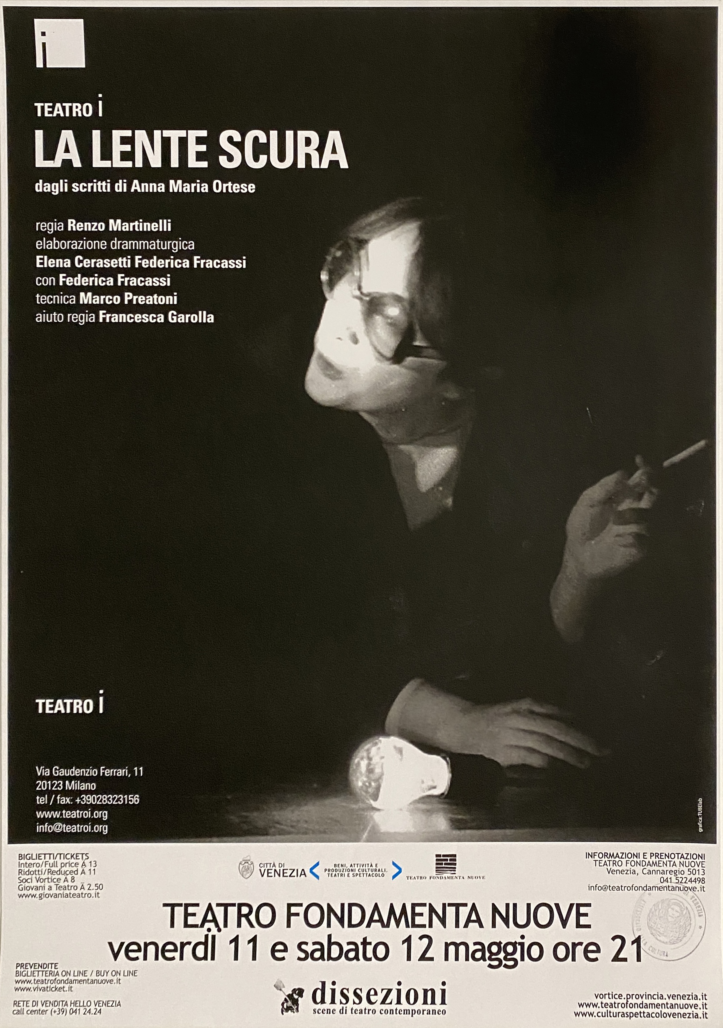 Lettura iconografica: riproduzione di fotografia; donna; figura femminile; tavolo; lampadina; sigaretta. Categoria merceologica/tipo evento: manifestazioni culturali; spettacolo teatrale; teatro; amministrazione pubblica; amministrazione comunale. Nomi: Città di Venezia Beni, Attività e Produzioni Culturali, Teatro e Spettacolo; Teatro Fondamenta Nuove; Teatro I; La Lente Scura; Anna Maria Ortese; Renzo Martinelli; Elena Cesaretti; Federica Fracassi; Marco Preantoni; Francesca Garolla; Provincia di Venezia; Vortice; Dissezioni Scene di Teatro Contemporaneo; Hello Venezia; TUBElab. Luoghi: Venezia; Veneto