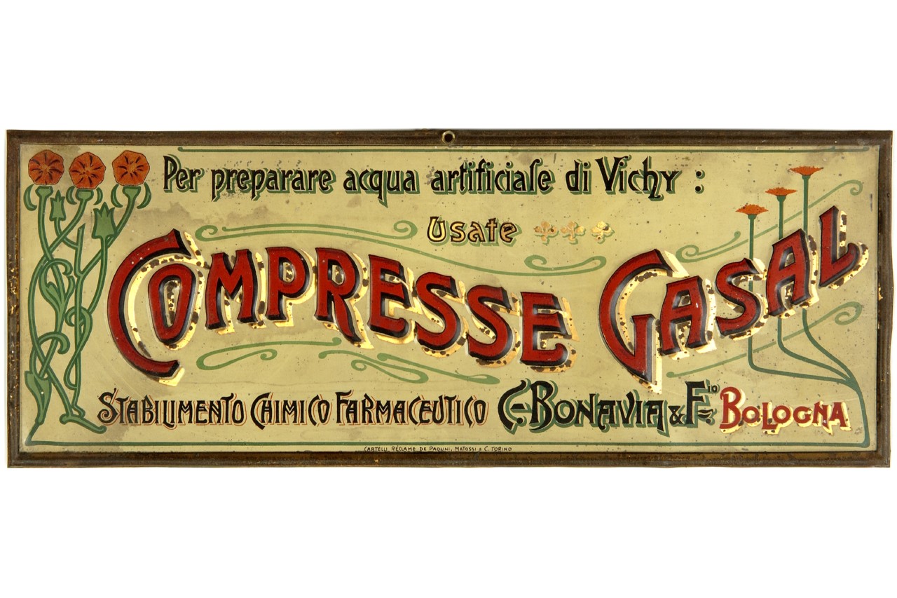 Lettura iconografica: scritte; fiori. Categoria merceologica/tipo evento: industria farmaceutica; industria alimentare; bevande; acqua minerale. Nomi: Acqua Artificiale Vichy; Compresse Gasal; Stabilimento Chimico Farmaceutico C. Bonavia e F.io. Luoghi: Bologna