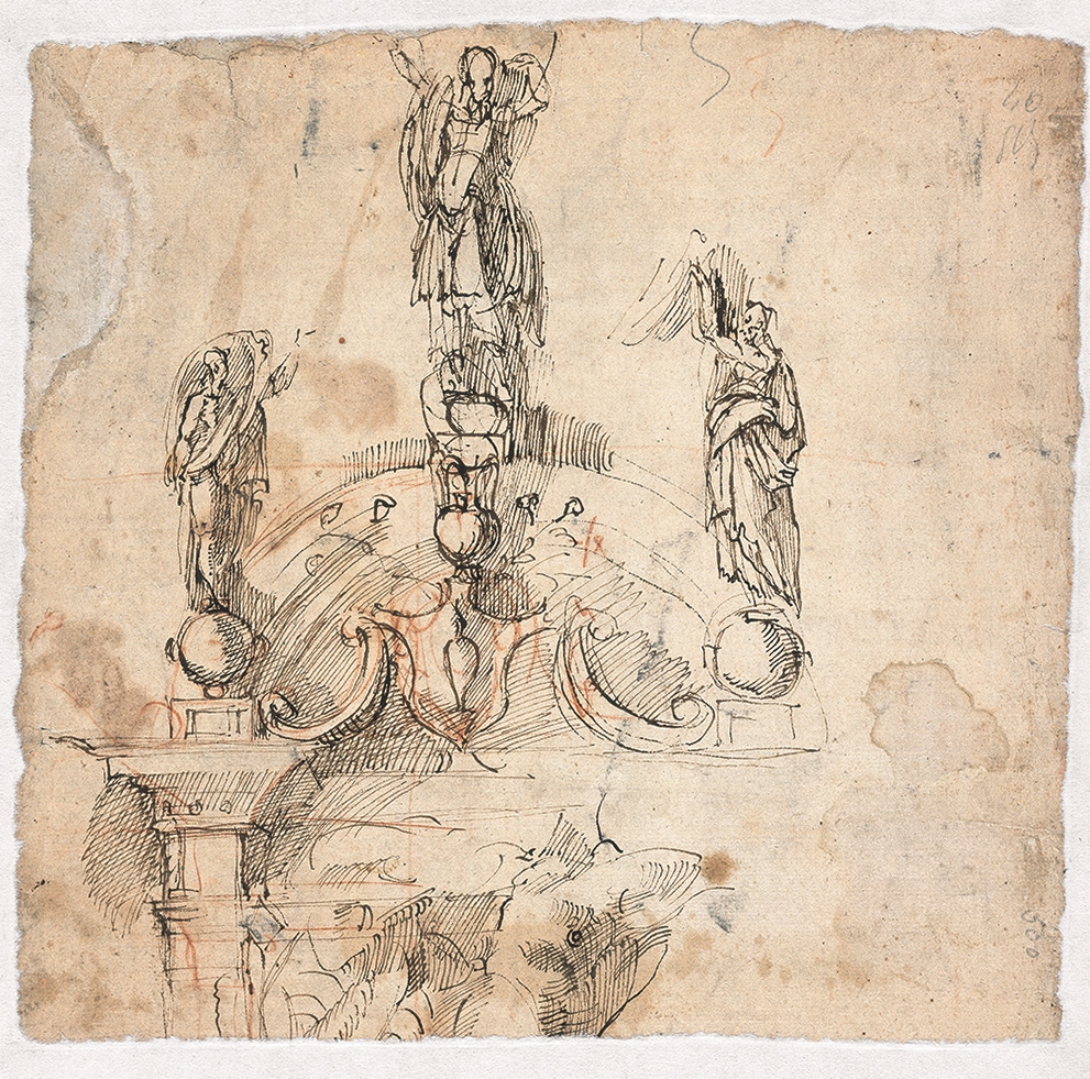 - NOTIZIE STORICO CRITICHE Il disegno del verso risulta realizzato da Michelangelo in lapis rosso, ma ripassato in penna e inchiostro in un secondo momento da altra mano, forse quella di Jacone. Vasari racconta che la Compagnia dell'Orciuolo aveva commissionato a Jacone la progettazione di un arco trionfale e della decorazione per il portale della Chiesa di San Felice in Piazza; forse l'artista chiese aiuto all'amico Michelangelo, che gli diede un suo disegno antecedente