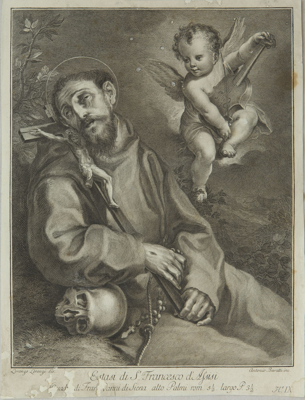 - NOTIZIE STORICO CRITICHE L'incisione raffigura un quadro di Francesco Vanni da Siena raffigurante l'Estasi di san Francesco d'Assisi, che stava nella collezione dei marchesi Gerini di Firenze. L'opera fu poi venduta nell'Ottocento insieme al resto della raccolta, e la sua ubicazione è oggi ignota. L'incisione appare per la prima volta nel secondo tomo della "Raccolta Di Stampe Rappresentanti i Quadri Più Scelti De' Signori Marchesi Gerini" (tav. IX), un'impresa editoriale voluta dal marchese Andrea Gerini per celebrare la sua imponente collezione d'arte, e pubblicata in due volumi, il primo dei quali uscito a stampa nel 1759, mentre il secondo solo nel 1786, assieme ad una riedizione del primo. Per la realizzazione dei disegni e la preparazione delle lastre, il marchese aveva incaricato l'abate volterrano Lorenzo Lorenzi, che soggiornava presso il suo palazzo, il quale si avvalse in qualche occasione della collaborazione di Violante Vanni. Le matrici poi vennero incise dai migliori intagliatori italiani dell'epoca: tra questi, vi era anche Antonio Baratti, che fu ingaggiato dal Gerini grazie alla mediazione di Anton Maria Zanetti il Vecchio, come dimostrato dalle ricevute di pagamento scoperte da M. Ingendaay. Grazie ad uno di questi documenti infatti, sappiamo che Baratti aveva già inciso la lastra con l'Estasi nel 1760. La tecnica utilizzata da Baratti, una commistione di acquaforte e bulino, riesce a rendere con estrema fedeltà le preziosità del dipinto, e accurati appaiono anche i passaggi chiaroscurali. La resa di alcuni dettagli, come ad esempio le lacrime del santo, sono tra i brani più squisitamente belli dell'opera. Nel Fondo Alpago-Novello, si trovano altre due incisioni che Baratti realizzò per la "Raccolta" del marchese Gerini (MCBL 9613, 9635)