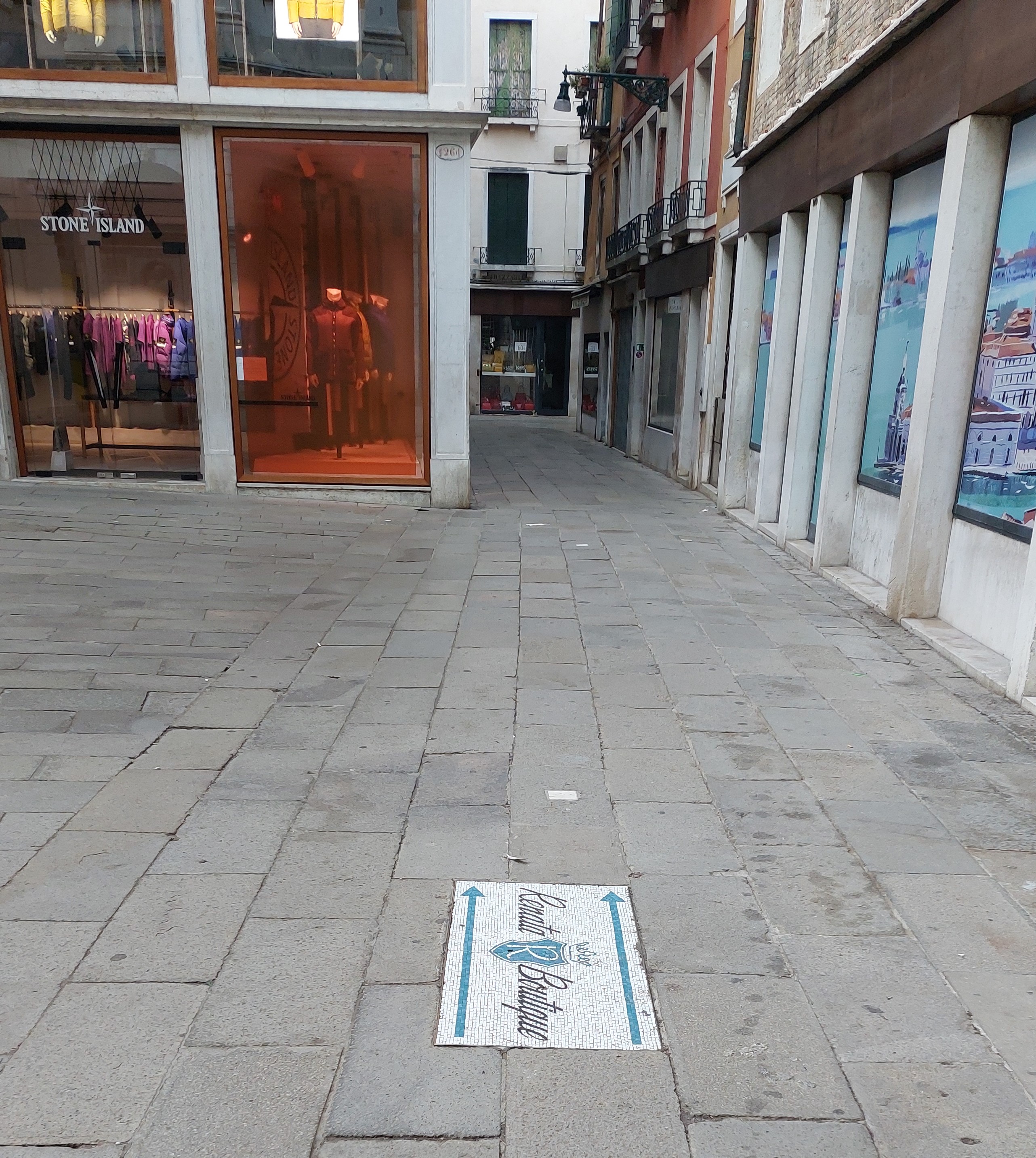 • NOTIZIE STORICO CRITICHE la targa pavimentale pubblicizzava un negozio di maglieria sita in Frezzaria al civico 1505 (al piano primo, al di sopra del sottoportico Contarina). Allo stato attuale delle ricerche documentarie si è giunti a determinare che, agli inizi degli anni Settanta del secolo scorso, il negozio era aperto solo nei mesi estivi durante il maggiore afflusso di turisti stranieri (Archivio Generale di Venezia (Celestia), X/7/23, anno 1968-1970)
