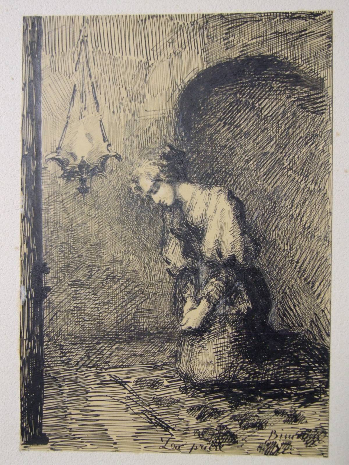 Il disegno, incollato su un supporto di cartone, rappresenta una donna in preghiera, inginocchiata e a mani giunte, in prossimità di una lanterna accesa
