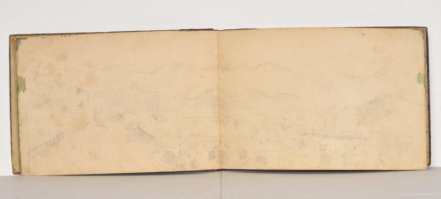 - NOTIZIE STORICO CRITICHE Il recto del foglio mostra la continuazione del paesaggio montano iniziato dall'artista-soldato nel verso del foglio precedente. Nel verso del foglio, invece, risalta il Monte Grappa, teatro di guerra, che Pierangelòo Villani ha saputo rendere apparentemente distante dal conflitto mondiale