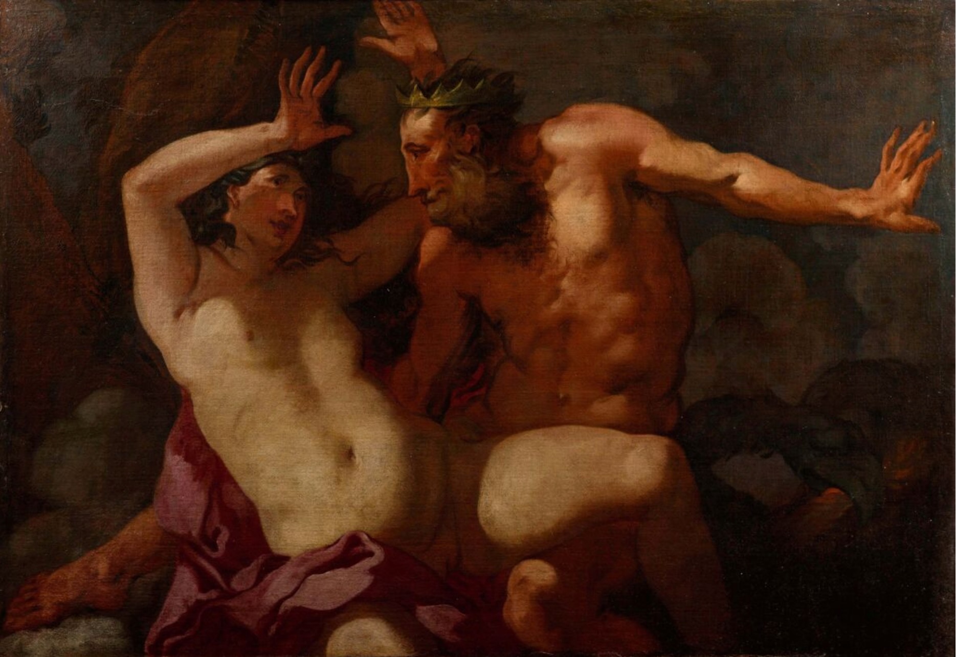 - NOTIZIE STORICO CRITICHE Già identificato come Nettuno e Melanto (Bologna, Fototeca Zeri scheda 56855), il dipinto, raffigurante Giove e Semele, è inventariato quale opera del pittore d'origine veneziana Giulio Carpioni. Della tela è registrato un passaggio sul mercato antiquario alla fine degli anni novanta del secolo scorso; tuttavia rimangono sconosciute le precedenti vicende collezionistiche. Essa potrebbe ipoteticamente essere identificata con il dipinto raffigurante "Semele spaventata dall'apparir di Giove accompagnato dall'aquila, e dall'incendio del fulmine", con figure quasi al naturale, già nella Galleria dell'abate Gian Battista Velo a Vicenza (Pilo 1961, p. 137), ma le misure indicate per il quadro già nella collezione vicentina sono maggiori di quelle dell'opera in esame