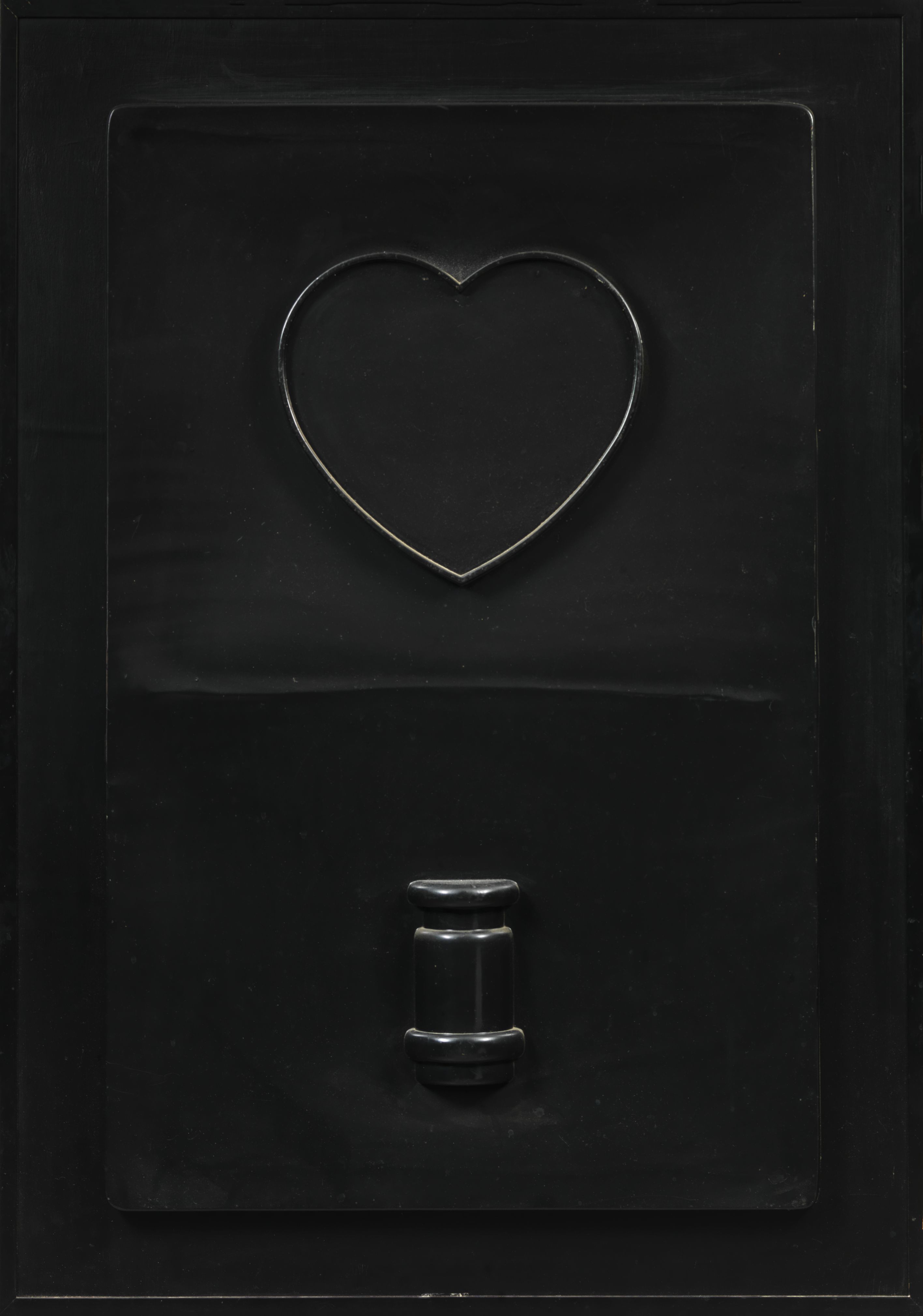 Composizione di colore nero con le sagome aggettanti di un cuore, nella parte superiore, e di un cilindro sezionato, nella parte inferiore