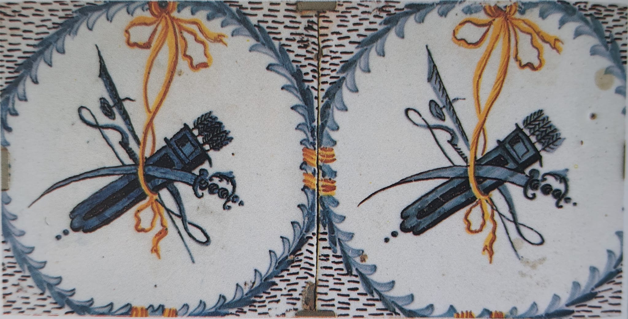 Piastrella da rivestimento in maiolica, quadrata e foggiata a stampo. La gamma cromatica verte sui toni di blu, bruno di manganese molto scuro, rosso, giallo. La decorazione policroma raffigura un trofeo di armi (arco, frecce e faretra; sciabola), inclinato e sorretto da un nastro annodato. Il motivo decorativo appare racchiuso in un cerchio delimitato da un festone fogliato. Nei quattro angoli, sullo sfondo, si delinea un ornato a piccoli tratti. Ai lati, elementi di raccordo in giallo connettono la piastrella a quella vicina