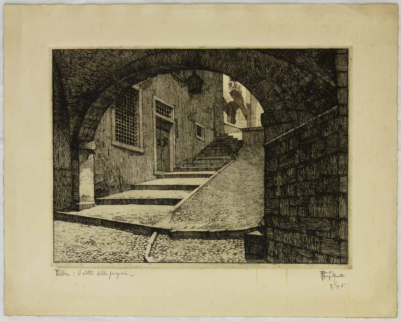 - NOTIZIE STORICO CRITICHE Luigi Alpago Novello così descrive l'incisione realizzata dal figlio Alberto: "Alberto Alpago Novello, Feltre 1914. E' l'estremità superiore delle Scalette Vecchie col portico del Teatro nello sfondo"