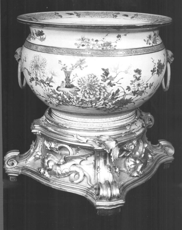 Base a sezione circolare. Corpo globulare con maniglie laterali ad anello applicate a testina zoomorfa. Apertura con bordo sporgente. Decorazione: motivi floreali policromi su fondo bianco; motivi a spirale in doppia fascia alla base