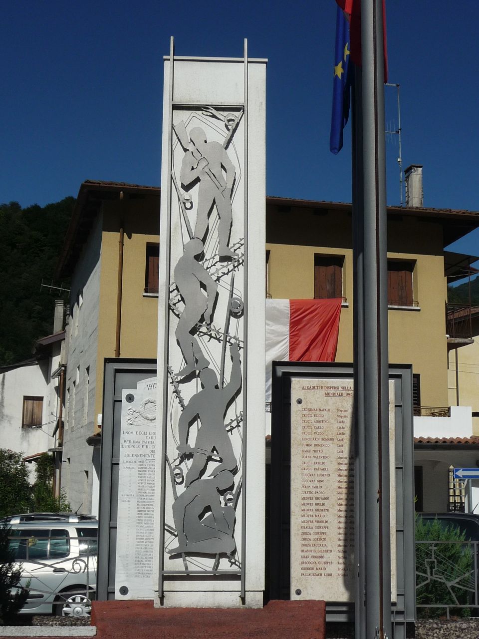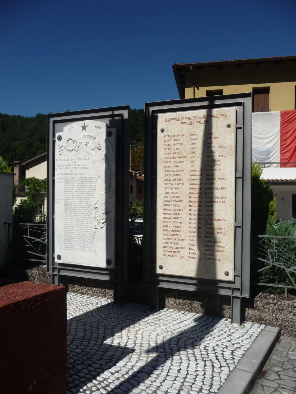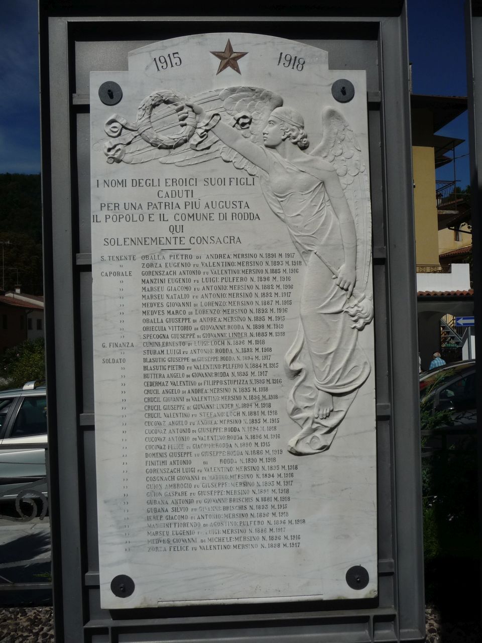 - ISCRIZIONI al centro - 1915 - 1918/ I NOMI DEGLI EROICI SUOI FIGLI/ CADUTI/ PER UNA PATRIA PIU' AUGUSTA/ IL POPOLO E IL COMUNE DI RODDA/ QUI SOLENNEMENTE CONSACRA/ S. TENENTE OBALLA PIETRO DI ANDREA: MERSINO N.1891 M.1917/ " ZORZA EUGENIO FU VALENTINO: MERSINO N. 1893 M. 1918/ CAPORALE GORENSZACH ANTONIO FU VALENTINO: MERSINO N.1885 M. 1916/ " MANZINI AUGENIO FU LUIGI: PULFERO N. 1896 M. 1916/ " MARSEU GIACOMO FU ANTONIO: MERSINO N. 1882 M.1916/ " MEDVES GIOVANNI DI LORENZO:MERSINO N.1887 M.1915/ " MEDVES MARCO DI LORENZO:MERSINO N. 1892 M. 1916/ " OBALLA GIUSEPPE DI ANDREA: MERSINO N.1895 M. 1915/ " ORIECUIA VITTORIO DI GIOVANNI: RODDA N. 1898 M. 1919/ " SPECOGNA GIUSEPPE DI GIOVANNI: LINDER N. 1885 M. 1918/ G. FINANZA CUMINI ERNESTO DI LUIGI: LOCH N. 1896 M. 1918/ " STURAM LUIGI FU ANTONIO: RODDA N. 1892 M. 1918/ SOLDATO BLASUTIG GIUSEPPE DI GIUSEPPE: RODDA N. 1894 M. 1917/ " BLASUTIG PIETRO FU VALENTINO: PULFERO N. 1884 M. 1915/ " BUTTERA ANGELO DI GIOVANNI: RODDA N. 1895 M. 1917/ " CEDARMAZ VALENTINO DI FILIPPO: STUPIZZA N. 1895 M. 1816/ " CRUCIL ANGELO DI ANDREA: MERSINO N. 1895 M. 1918/ " CRUCIL GIOVANNI DI VALENTINO: MERSINO N. 1896 M. 1918/ " CRUCIL GIUSEPPE DI GIOVANNI: LINDER N. 1894 M. 1918/ " CRUCIL VALENTINO FU STEFANO: LOCH N. 1881 M. 1918/ " CUCOVAZ ANGELO FU ANDREA: MERSINO N. 1895 M. 1915/ " CUCOVAZ ANTONIO DI GIUSEPPE: RODDA N. 1894 M. 1918/ " CUCOVAZ ANTONIO DI VALENTINO: RODDA N. 1896 M. 1916/ " CUCOVAZ FELICE DI GIACOMO: RODDA N. 1890 M. 1915/" DOMENIS GIUSEPPE FU GIUSEPPE: RODDA N. 1886 M. 1919/ " FINITIMI ANTONIO DI RODDA N. 1890 M. 1918/ " GORENSZACH LUIGI FU VALENTINO: MERSINO N. 1895 M. 1918/ COSGNACH GIOVANNI DI MATTEO: MERSINO N. 1894 M. 1916/ " GUION AMBROGIO FU GIUSEPPE: MERSINO N. 1893 M. 1917/ " GUION GASPARE FU GIUSEPPE: MERSINO N. 1891 M. 1918/ " GUBANA ANTONIO FU GIOVANNI: BRISCHIS N. 1881 M. 1915/ " IEREP GIACOMO DI ANTONIO: MERSINO N. 1896 M. 1918/ " MANZINI FIORENDO DI AGOSTINO: PULFERO N. 1896 M. 1918/ " MARSEU EUGENIO FU LUIGI: MERSINO N. 1886 M. 1917/ " MEDVES GIOVANNI DI MICHELE: MERSINO N. 1896 M. 1916/ " ZORZA FELICE FU VALENTINO: MERSINO N. 1898 M. 1917 - capitale - a incisione - italiano