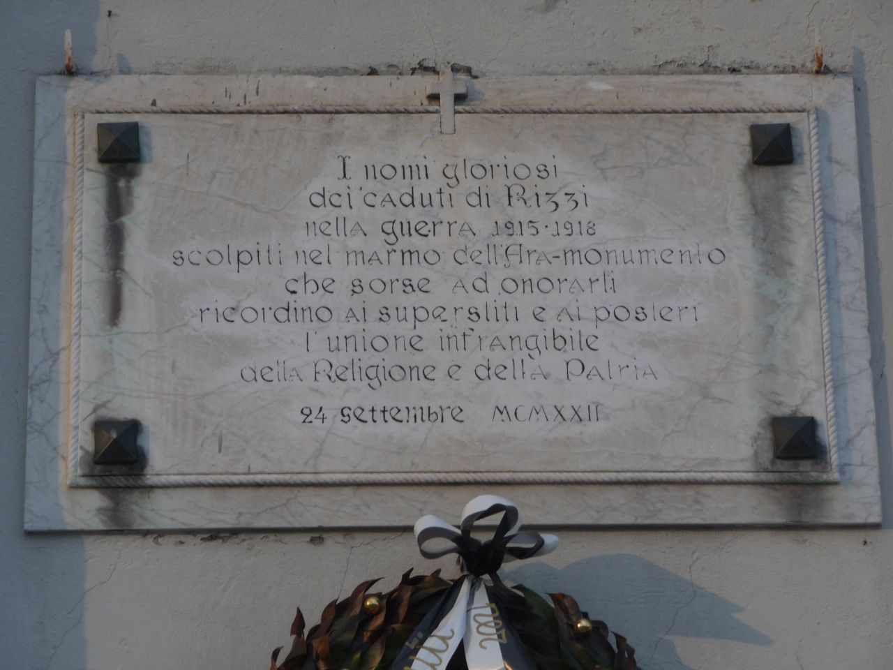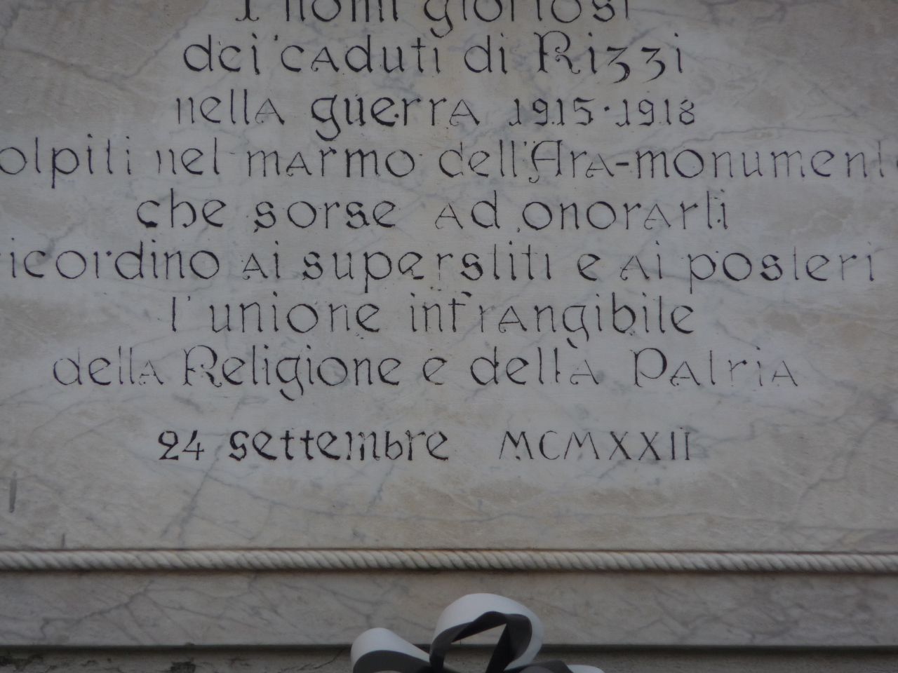 • ISCRIZIONI al centro - I NOMI GLORIOSI/ DEI CADUTI DI RIZZI/ NELLA GUERRA 1915-1918/ SCOLPITI NEL MARMO DELL'ARA-MONUMENTO/ CHE SORSE AD ONORARLI/ RICORDINO AI SUPERSTITI E AI POSTERI/ L'UNIONE INFRANGIBILE/ DELLA RELIGIONE E DELLA PATRIA/ 24 SETTEMBRE MCMXXII - stampatello minuscolo - a incisione - italiano