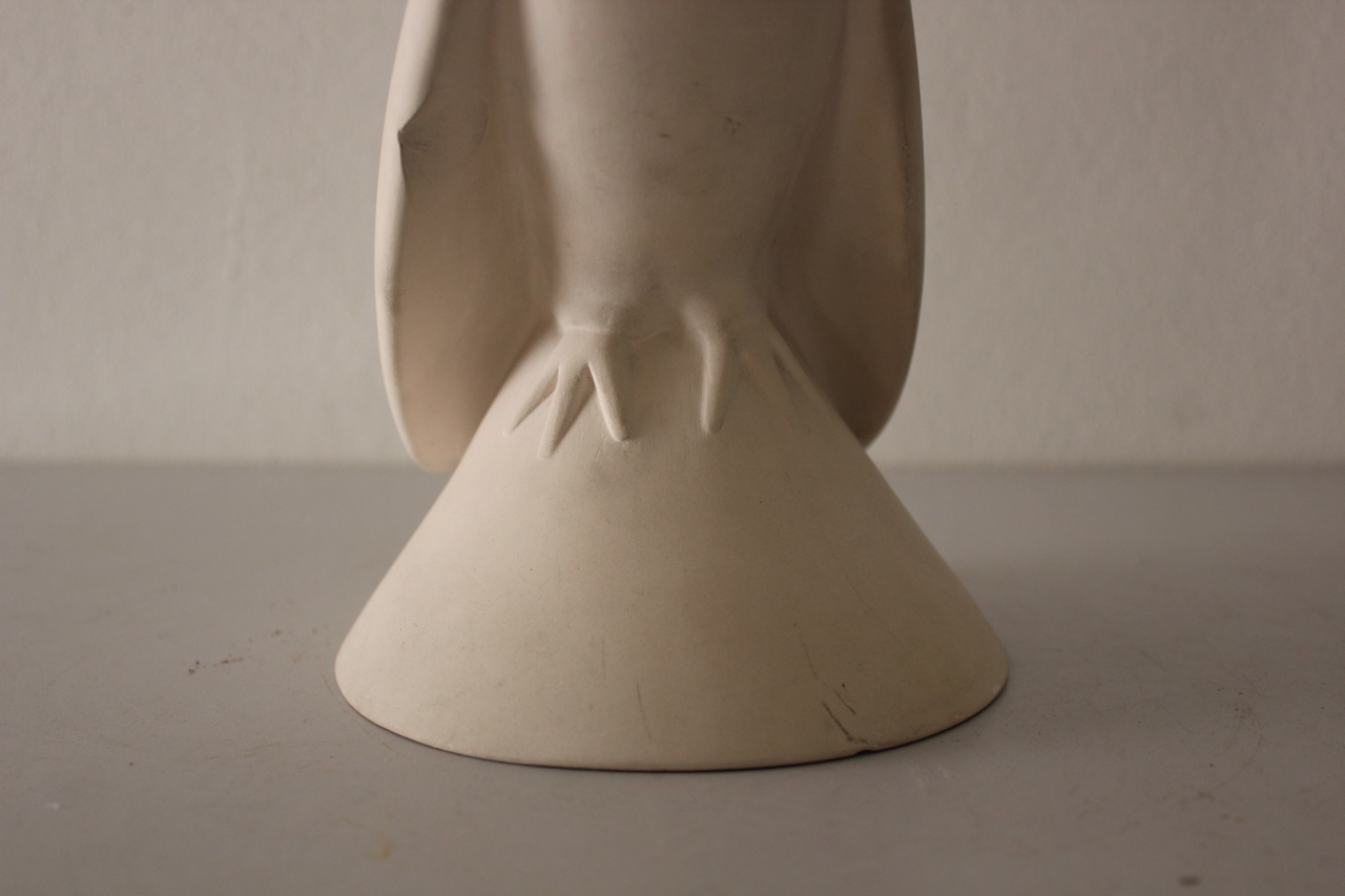 Scultura in terraglia tenera raffigurante un uccello marino accovacciato su una pietra con il collo proteso verso l'alto