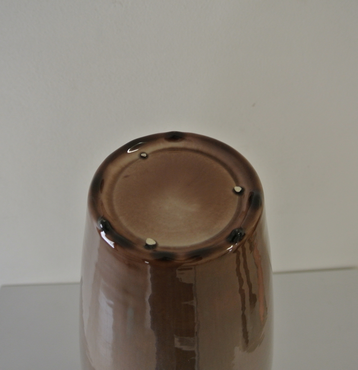 Vaso in ceramica di forma ovoidale con collo a tromba. Colature di smalto grigio e marrone con gocce alla base