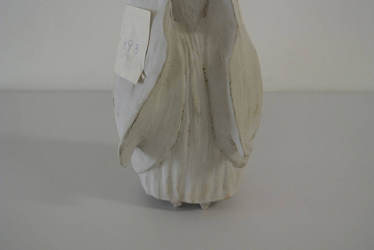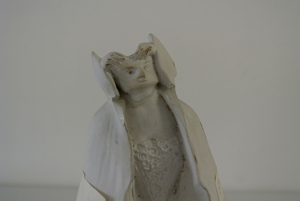 Scultura in terraglia tenera priva di rivestimento esterno, raffigurante un donna veneziana in costume di carnevale. Il mantello è aderente su un'ampia gonna, la quale determina una forma a pera alla scultura. Il corpetto è merlettato, la maschera con orecchie d'asino
