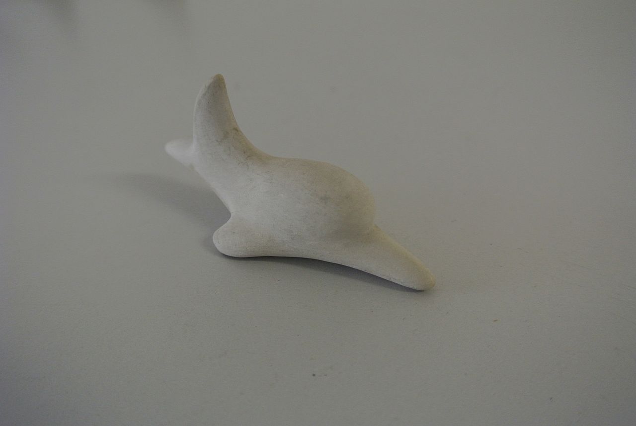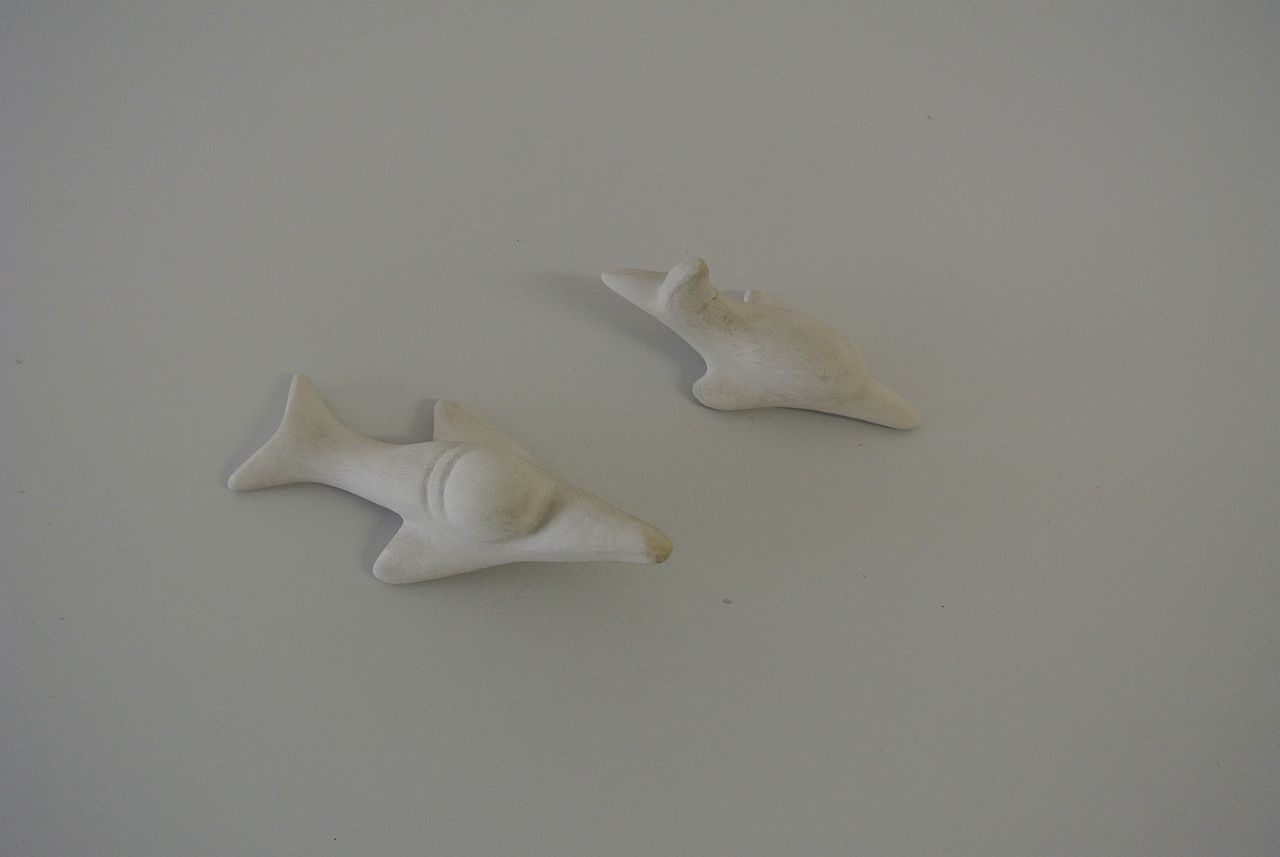Serie di cinque sculture in terraglia tenera prive di rivestimento esterno raffiguranti dei delfini; quattro hanno le stesse dimensioni, uno è più piccolo degli altri