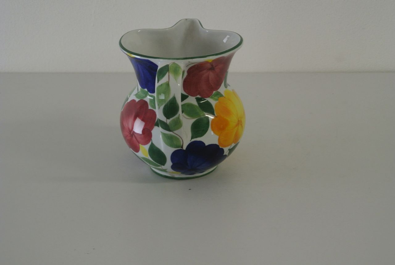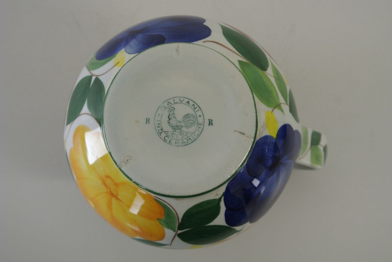 Boccale con decorazione di fiori gialli, rossi e blu e foglie sfondo bianco