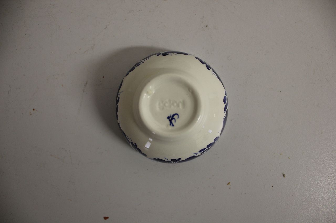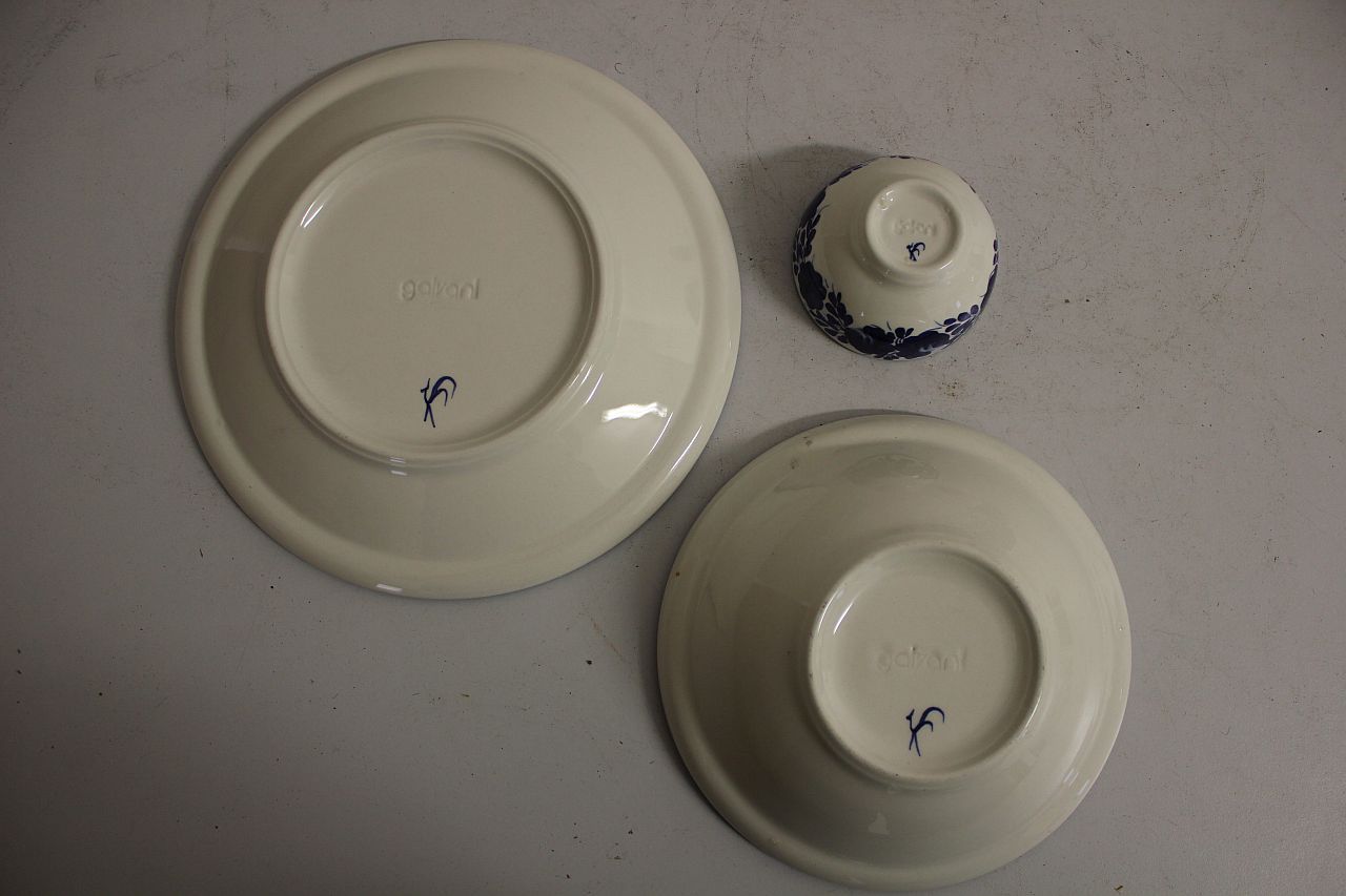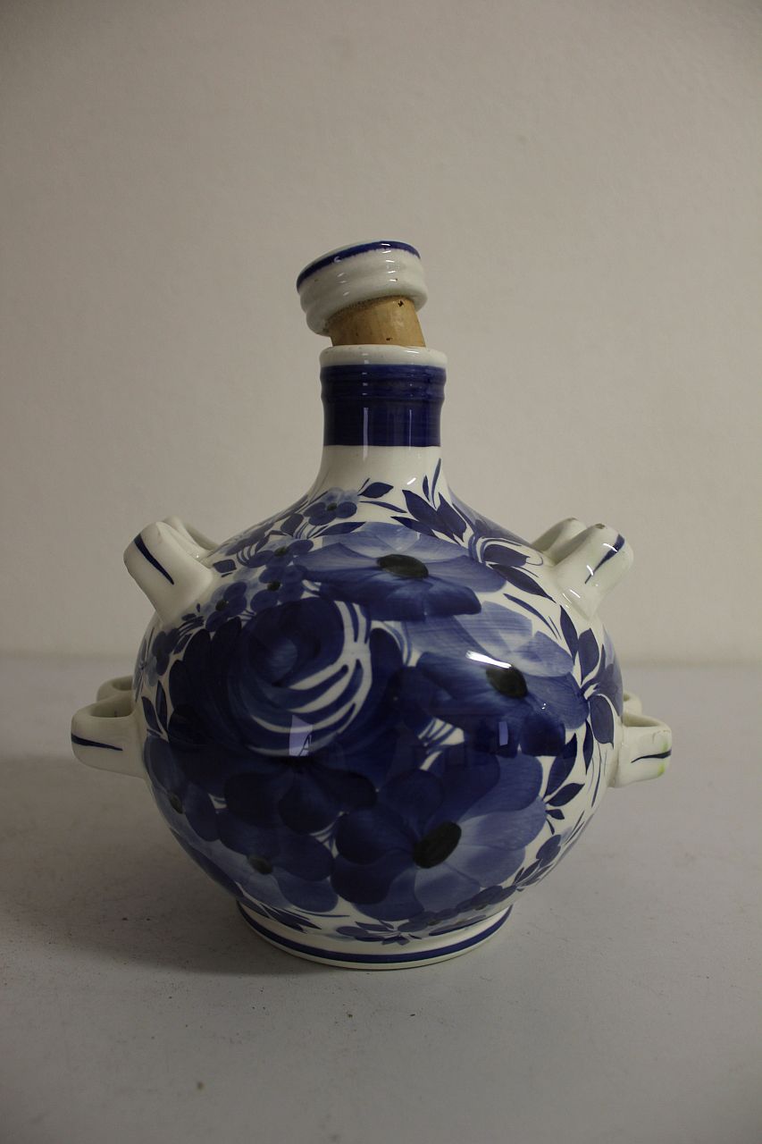 Fiasca, tazzina, piattino e fondina in ceramica. "A" fiasca, o orciolo, a quattro manici con due fori ciascuno per il passaggio della cordicella; manici, tappo e base filettati di blu. 'E un modello preso dal vecchio "Cruche". "B" tazzina senza manico con decoro di fiori blu. "C" e "D" piattino e fondina con lo stesso decoro di "B"