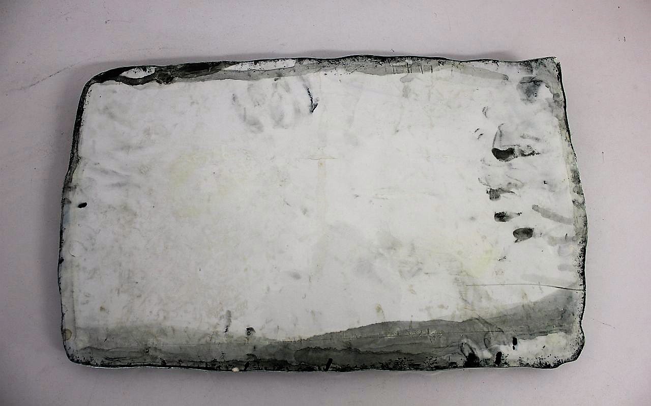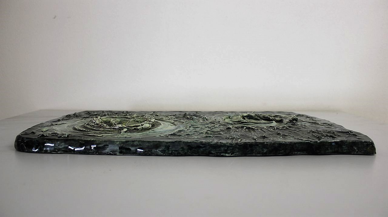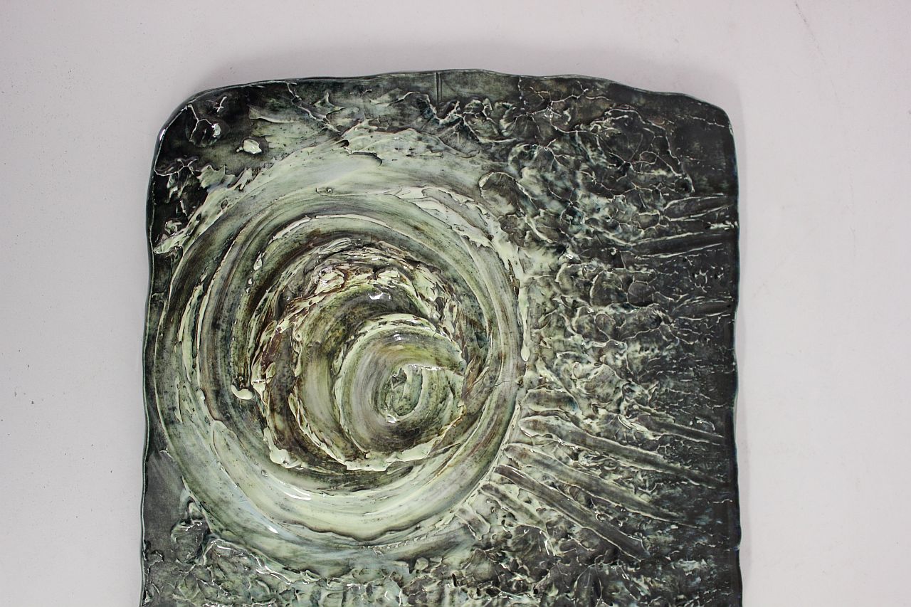 Piastra in ceramica, di forma rettangolare irregolare, motivo a spirale lavorata a dito e a stecco su pasta molle, colori grigio, marron e qualche lumeggiatura di giallo
