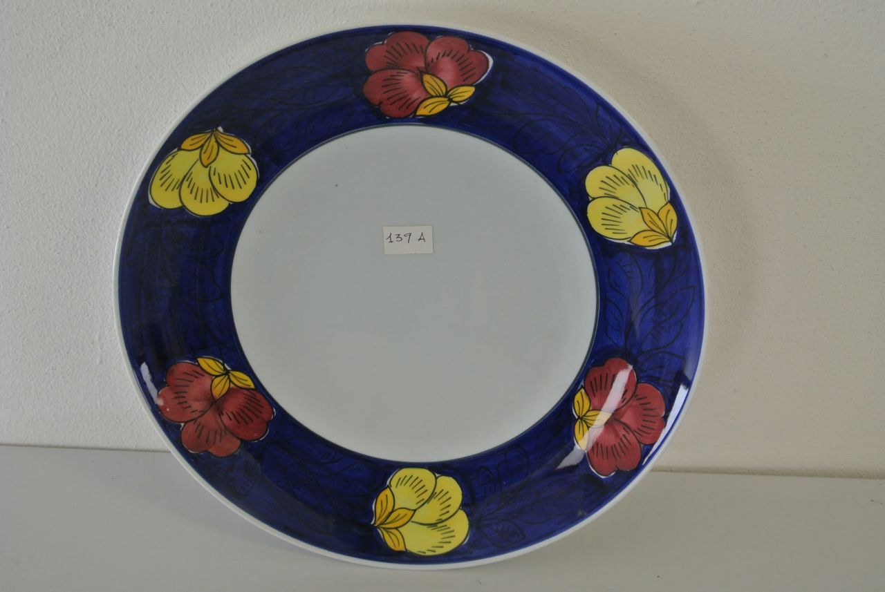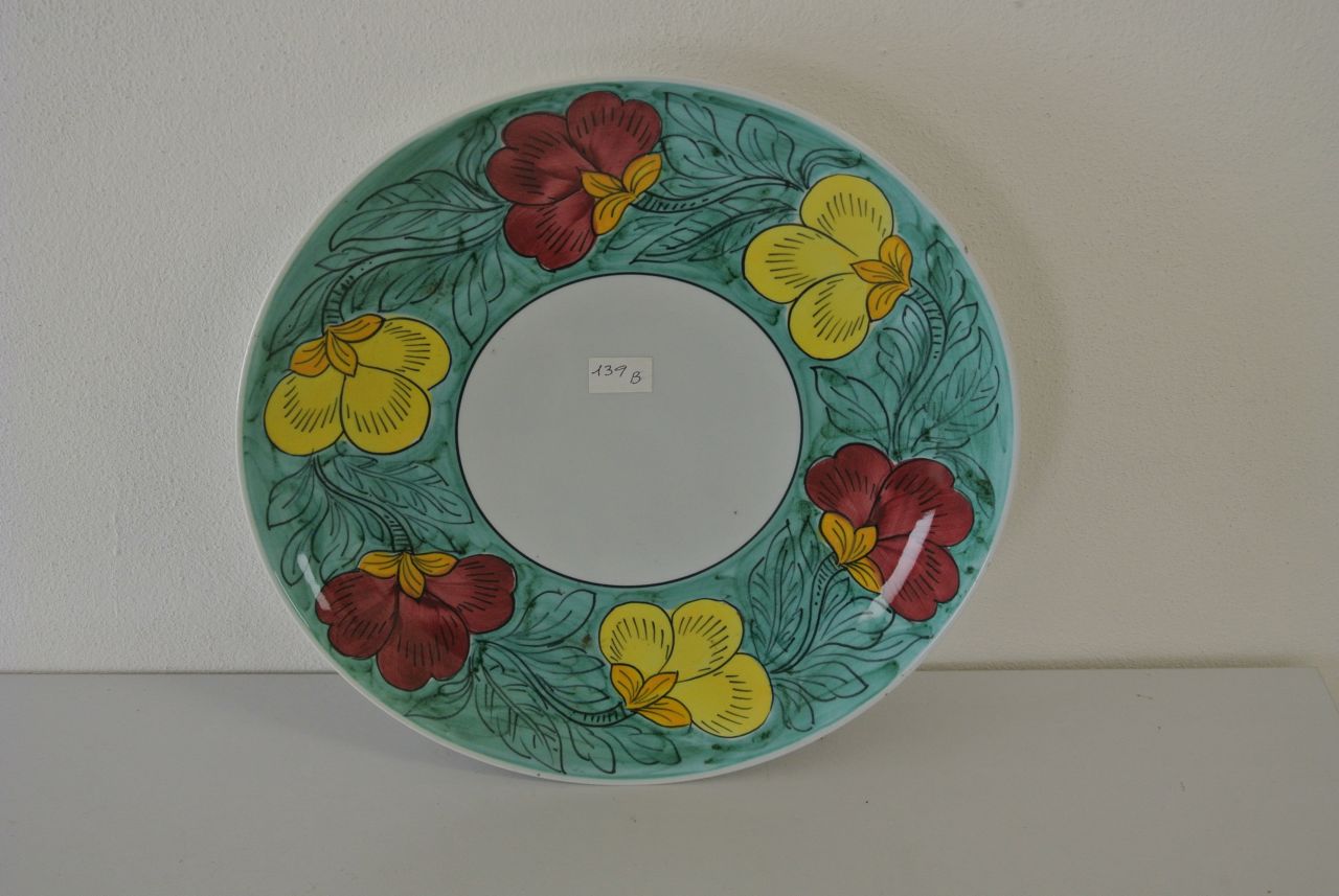 Due piatti in ceramica "A" e "B". "A" con calotta bassa, fascia blu e fiori a seguire gialli e rossi; "B" simile ad "A", ma con fascia verde chiaro e corona a seguire con fiori, rami e foglie. I fiori sono rossi e gialli e il resto al tratto in nero