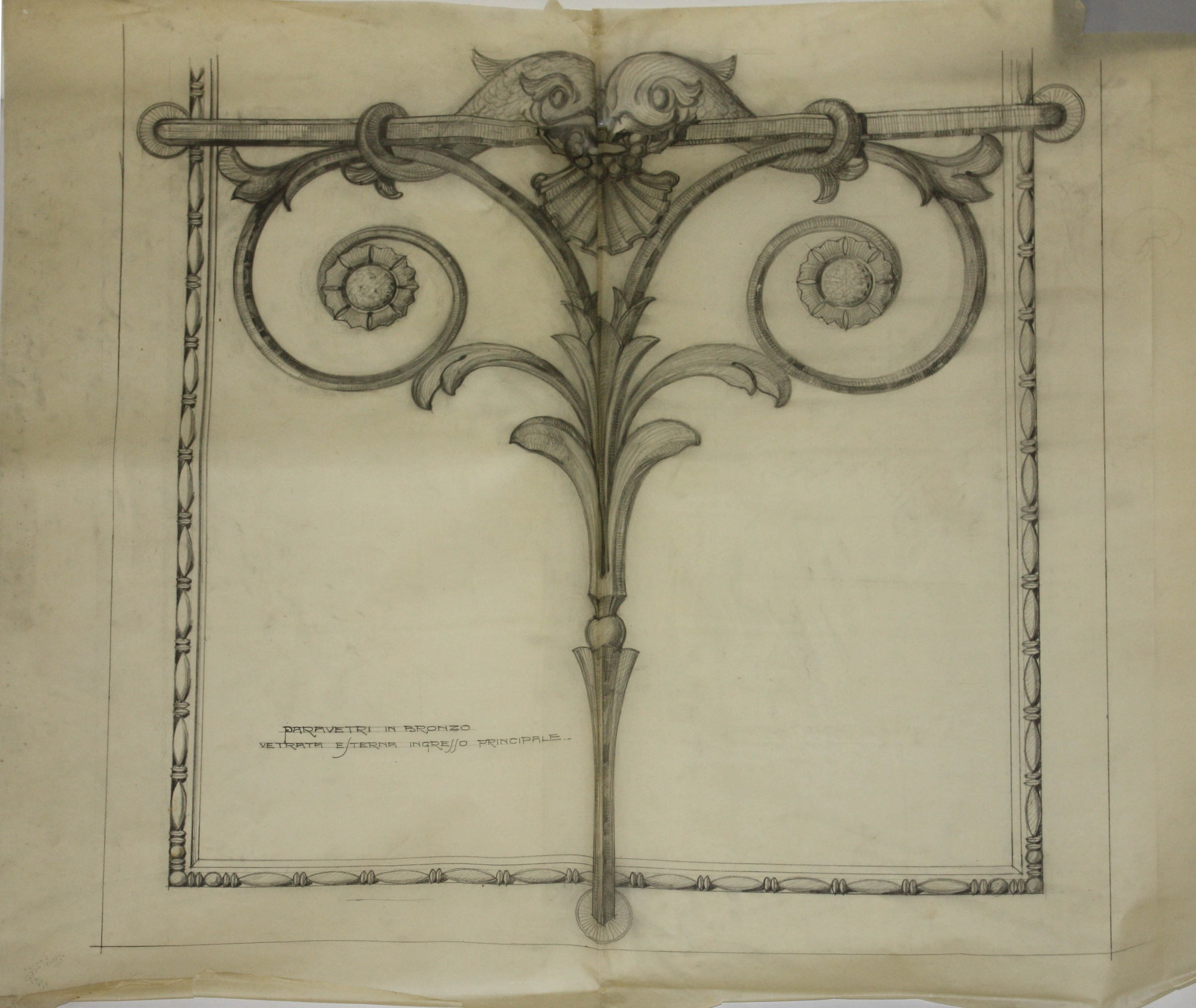Studio per il paravetri in bronzo della vetrata esterna dell’ingresso principale. Dal motivo centrale floreale si sviluppano simmetricamente due volute dove s’inseriscono altrettanti delfini affrontati. Esiste una variante senza delfini
