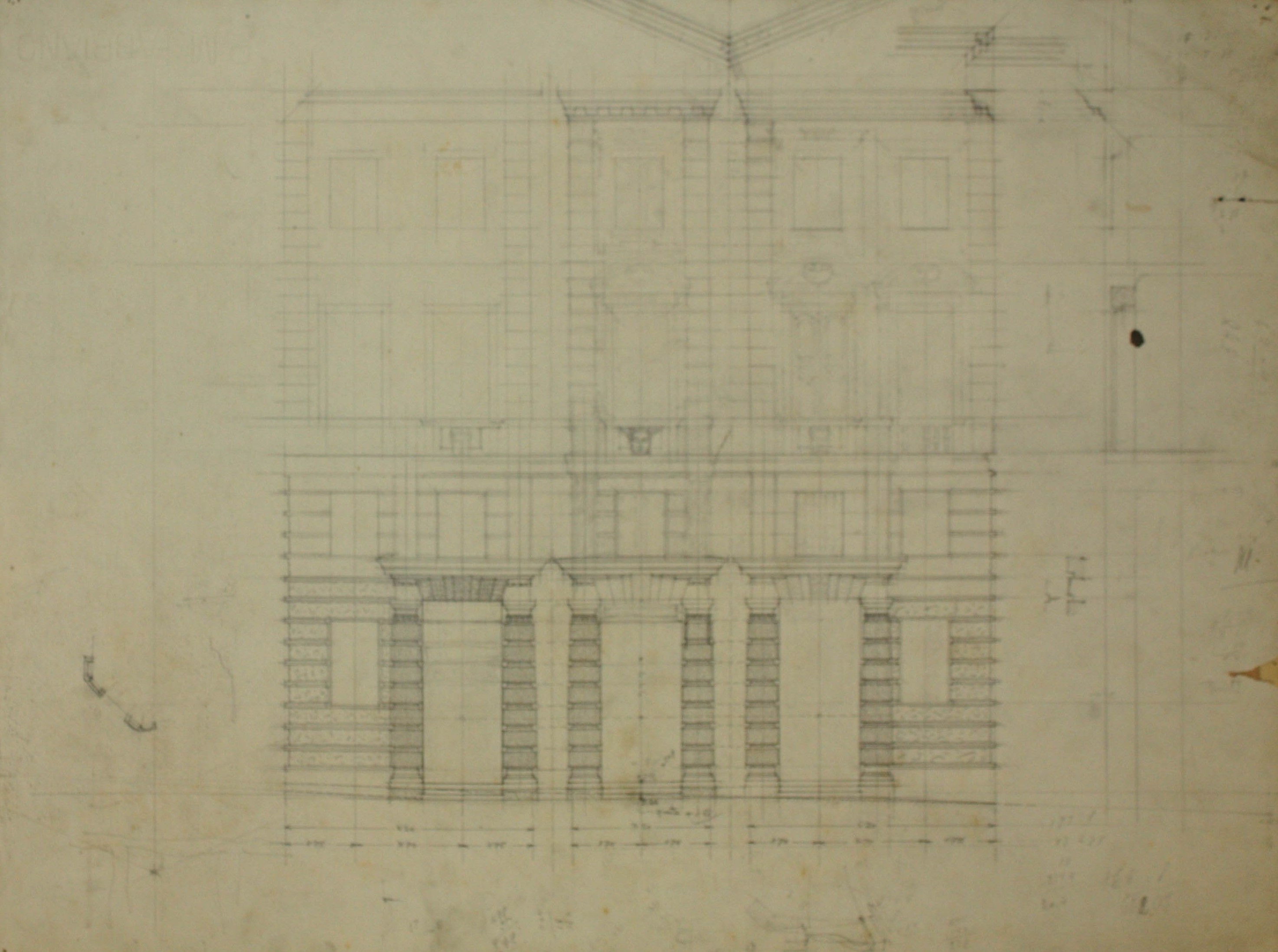 Stralci prospetti per la soluzione d’angolo e l’ingresso principale. Lo studio presenta delle differenze rispetto ai disegni definitivi, sia per le finestre del primo piano che diventeranno timpanate sia per la soluzione dei tre portoni