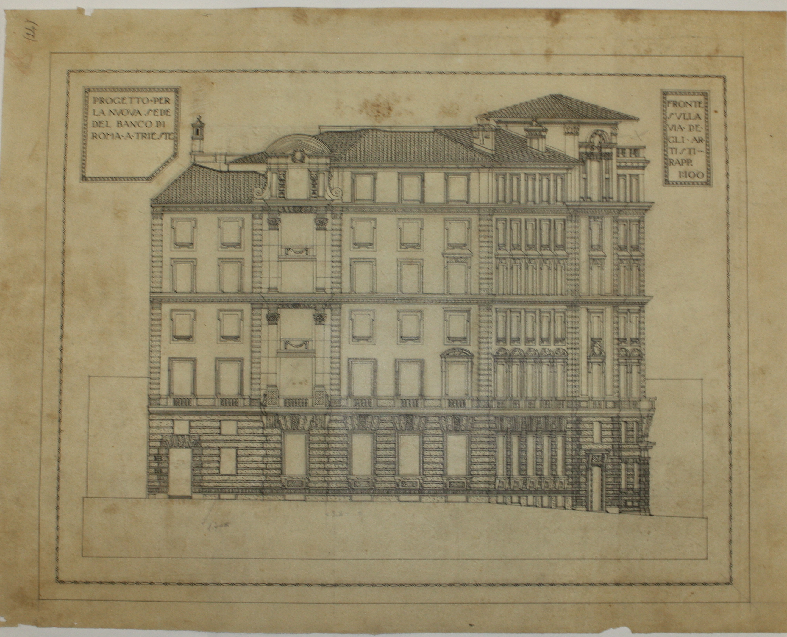 Il foglio è una prima una versione dei prospetti su via degli Artisti. Il progetto realizzato, anch’esso in stile eclettico, si differenzia per una maggiore semplificazione delle forme e la sostituzione del bugnato dei piani superiori con l’intonaco. Scala 1:100