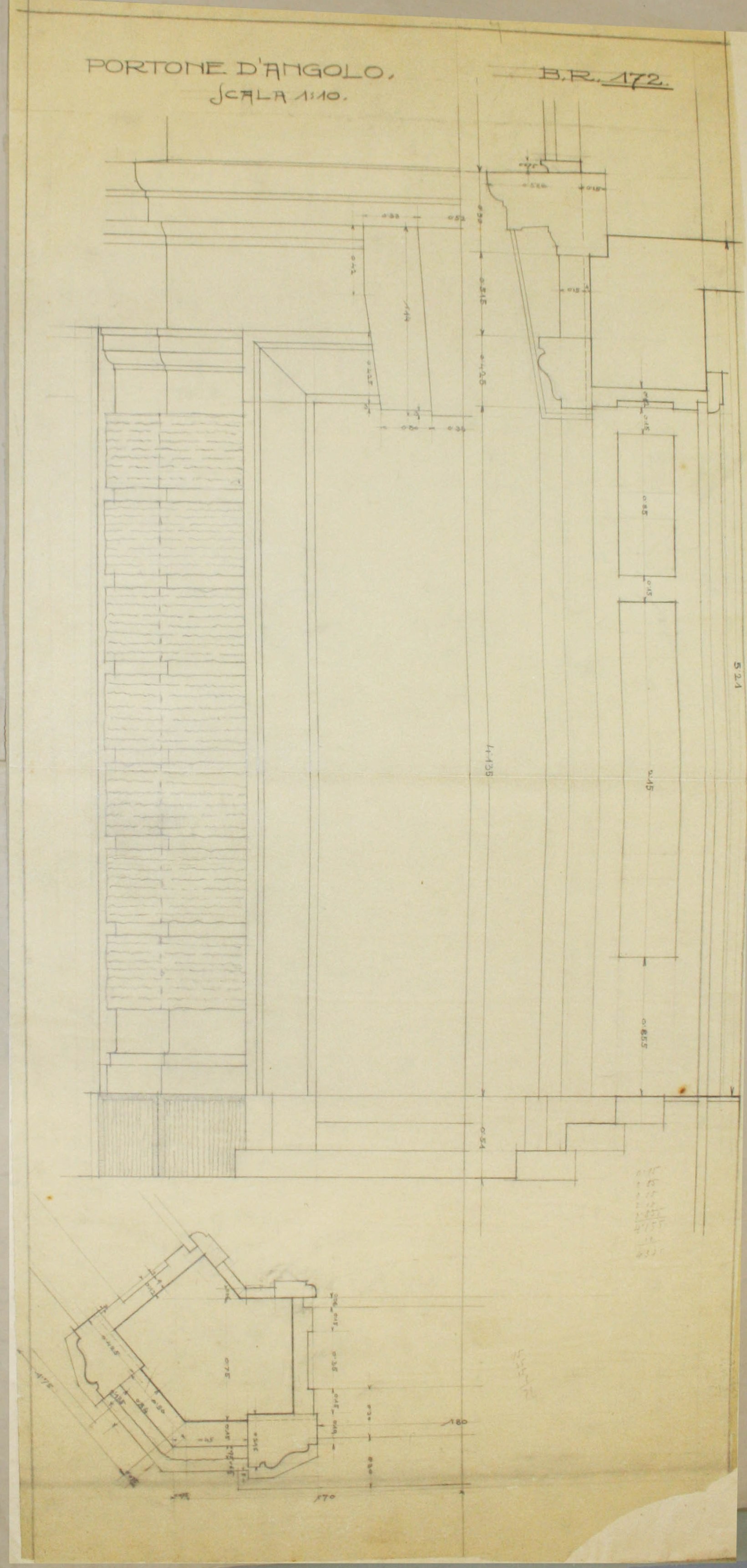 Prospetto, sezione e pianta del portone d’angolo sul Corso Vittorio Emanuele III. L’impianto mostra come uno dei modelli di riferimento per l’edificio sia il Rinascimento, con particolare attenzione alle modanature e al bugnato del piano terreno