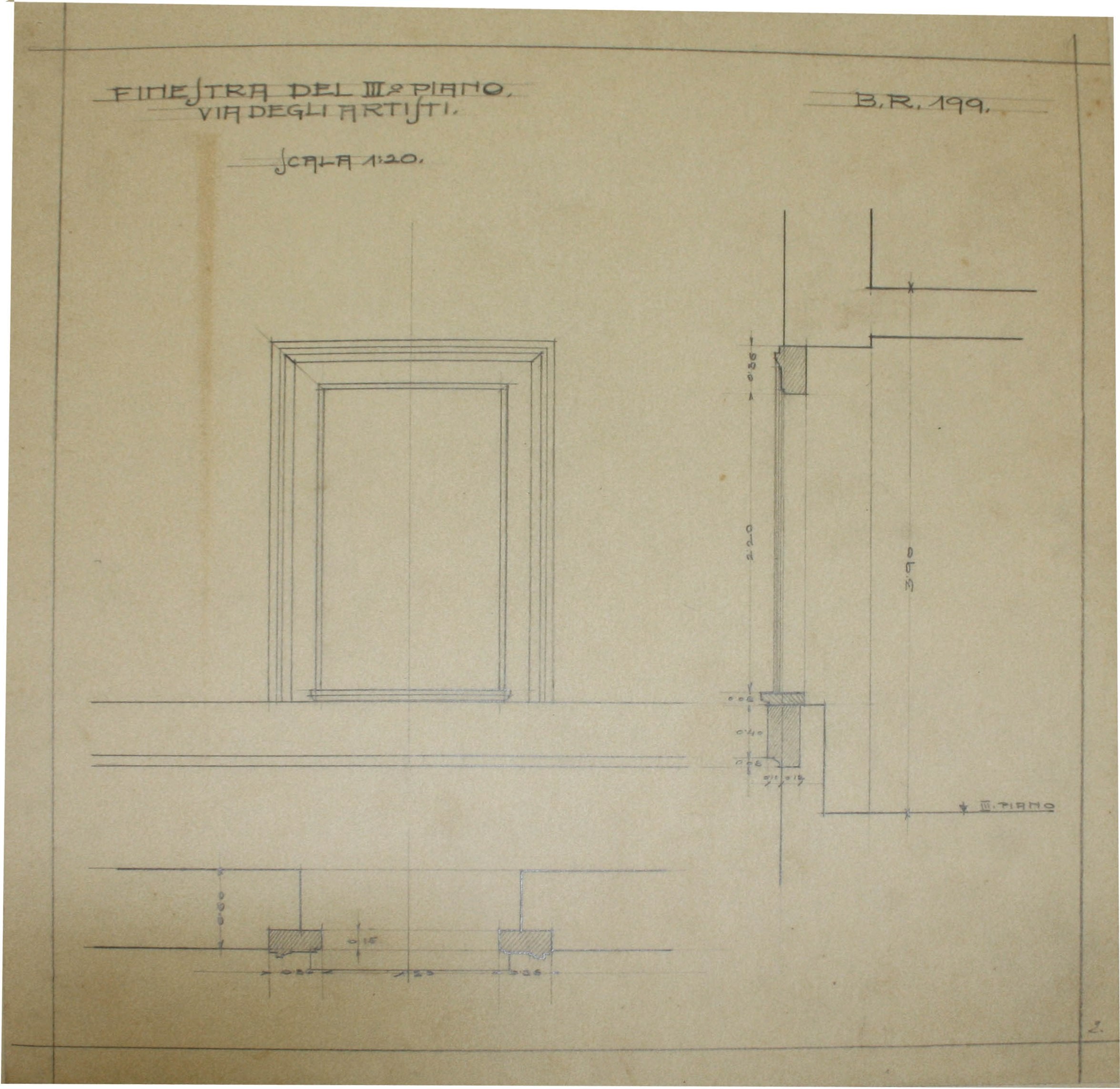 Pianta prospetto e sezione della finestra del terzo piano su Via degli artisti in scala 1:20