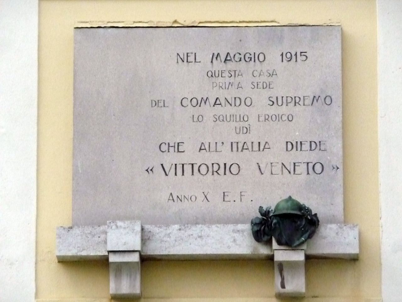 - ISCRIZIONI centro/ sostata a destra - NEL MAGGIO 1915/ QUESTA CASA/ PRIMA SEDE/ DEL COMANDO SUPREMO/ LO SQUILLO EROICO/ UDI'/ CHE ALL'ITALIA DIEDE/ «VITTORIO VENETO»/ ANNO X E.F - capitale - a incisione -