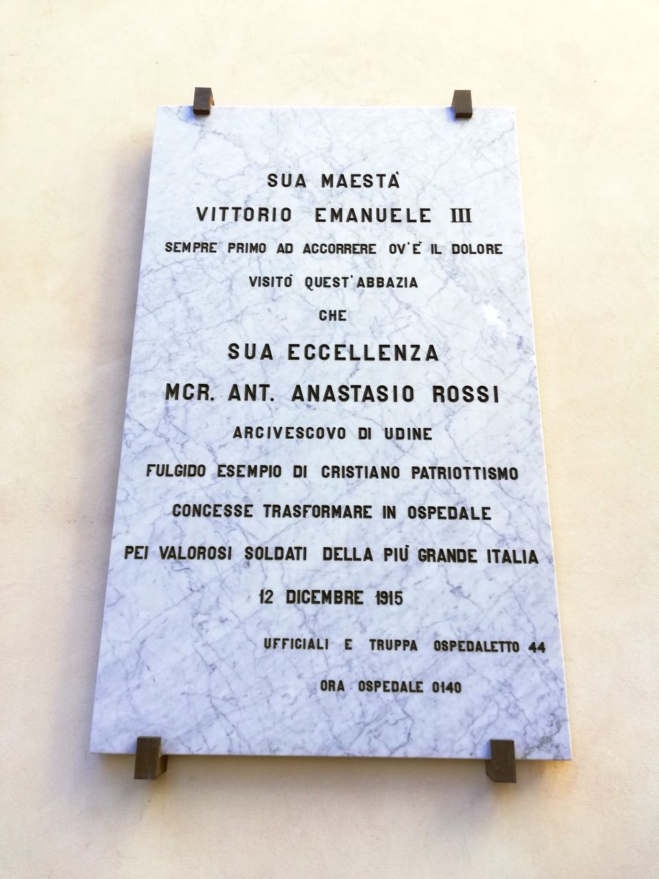 - ISCRIZIONI al centro - SUA MAESTA'/ VITTORIO EMANUELE III/ SEMPRE PRIMO AD ACCORRERE OV'E' IL DOLORE/ VISITO' QUEST'ABBAZIA/ CHE/ SUA ECCELLENZA/ MCR. ANT. ANASTASIO ROSSI/ ARCIVESCOVO DI UDINE/ FULGIDO ESEMPIO DI CRISTIANO PATRIOTTISMO/ CONCESSE TRASFORMARE IN OSPEDALE/ PEI VALOROSI SOLDATI DELLA PIU' GRANDE ITALIA/ 12 DICEMBRE 1915/ UFFICIALI E TRUPPA OSPEDALETTO 44/ ORA OSPEDALE 0140 - maiuscolo - a caratteri applicati -