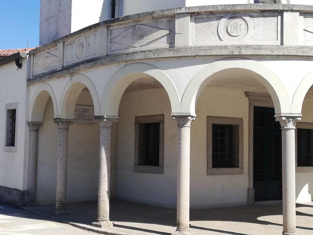 La loggia semicircolare si inserisce nel prospetto principale della chiesa cinquesentesca di San Rocco. Il portico, con copertura piana, chiude la facciata della chiesa e parte del lato sinistro dove si colloca il campanile. Sobrio e severo nel disegno, il monumento è formato da otto archi classici a tutto sesto, sostenuti da nove colonne bocciardate con capitello a foglie d'acanto. Al di sopra la copertura piana presenta un alto parapetto cadenzato e decorato da forme geometriche