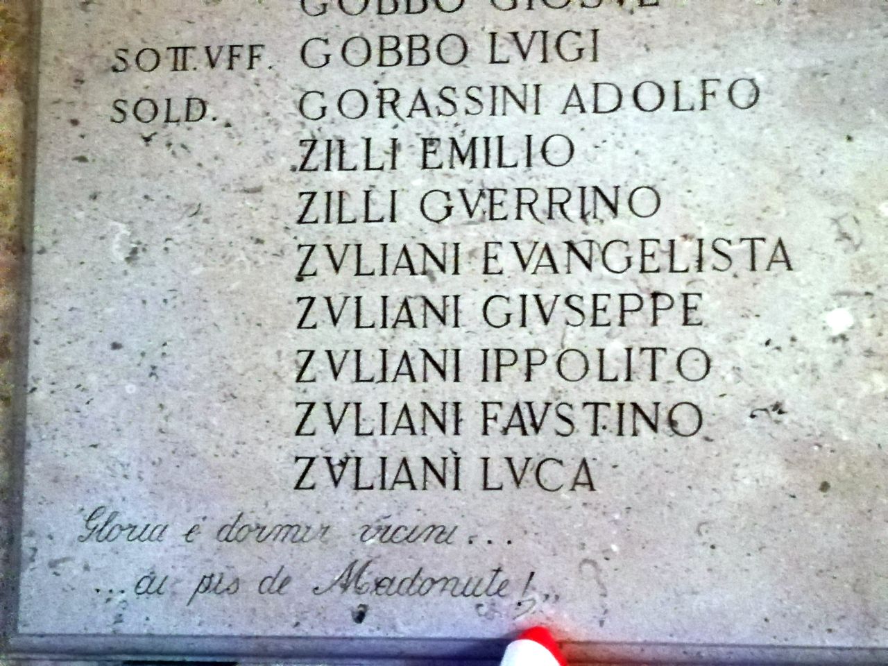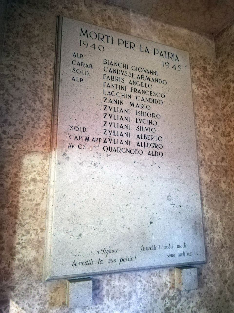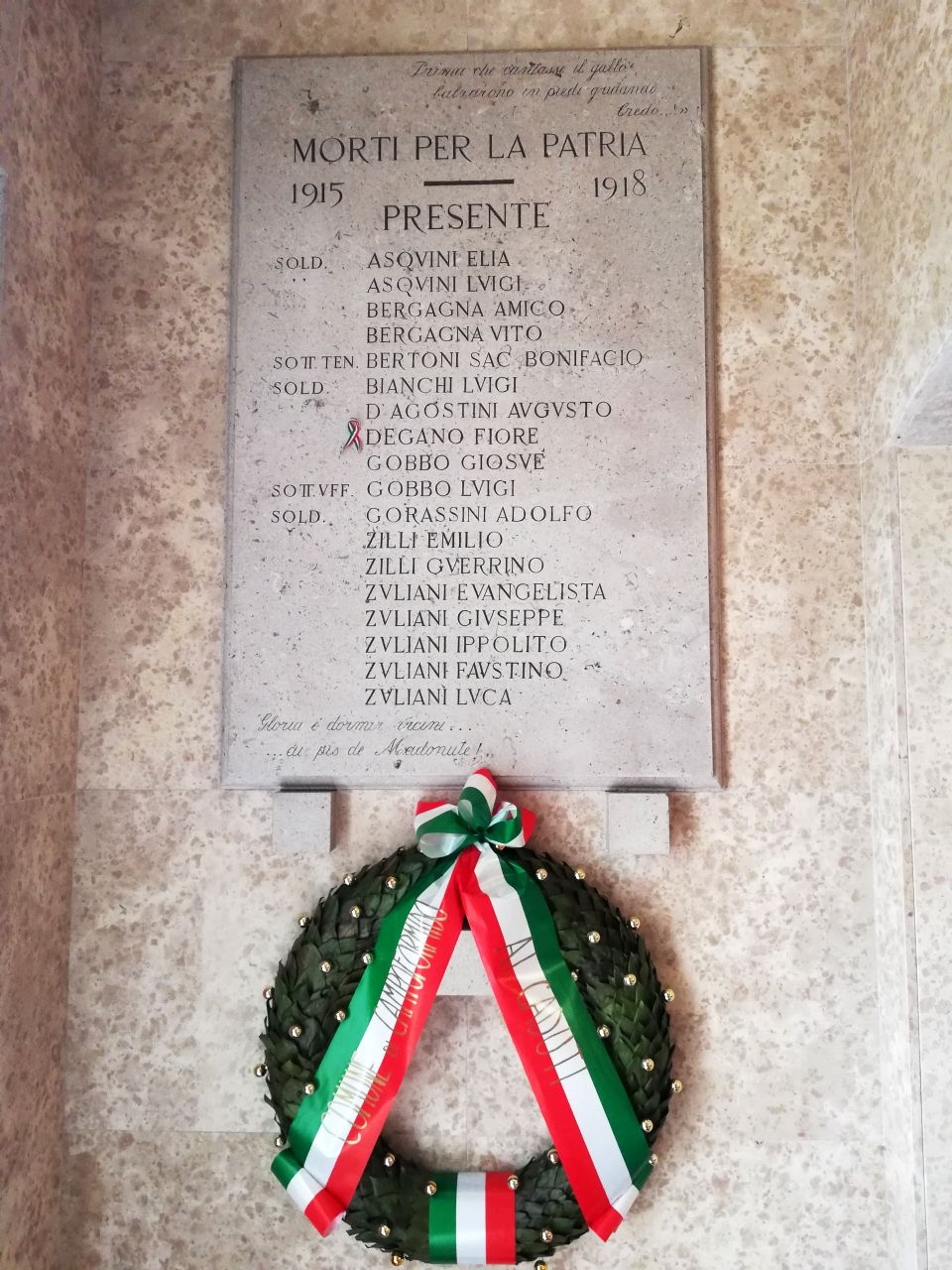- ISCRIZIONI al centro - PRIMA CHE CANTASSE IL GALLO/ BALZARONO IN PIEDI GRIDANDO/ CREDO..!"// MORTI PER LA PATRIA/ 1915 -- 1918/ PRESENTE/ SOLD. ASQVINI ELIA/ " ASQVINI LVIGI/ " BERGAGNA AMICO/ " BERGAGNA VITO/ SOTT. TEN. BERTONI SAC. BONIFACIO/ SOLD. BIANCHI LVIGI/ " D'AGOSTINO AVGVSTO/ " DEGANO FIORE/ " GOBBO GIOSVE'/ SOTT.VFF. GOBBO LVIGI/ SOLD. GORASSINI ADOLFO/ " ZILLI EMILIO/ " ZILLI GVERRINO/ " ZVLIANI EVANGELISTA/ " ZVLIANI GIVSEPPE/ " ZVLIANI IPPOLITO/ " ZVLIANI FAVSTINO/ " ZVLIANI LVCA// GLORIA E' DORMIR VICINI.../ ...AI PIS DE MADONUTE!" - capitale -