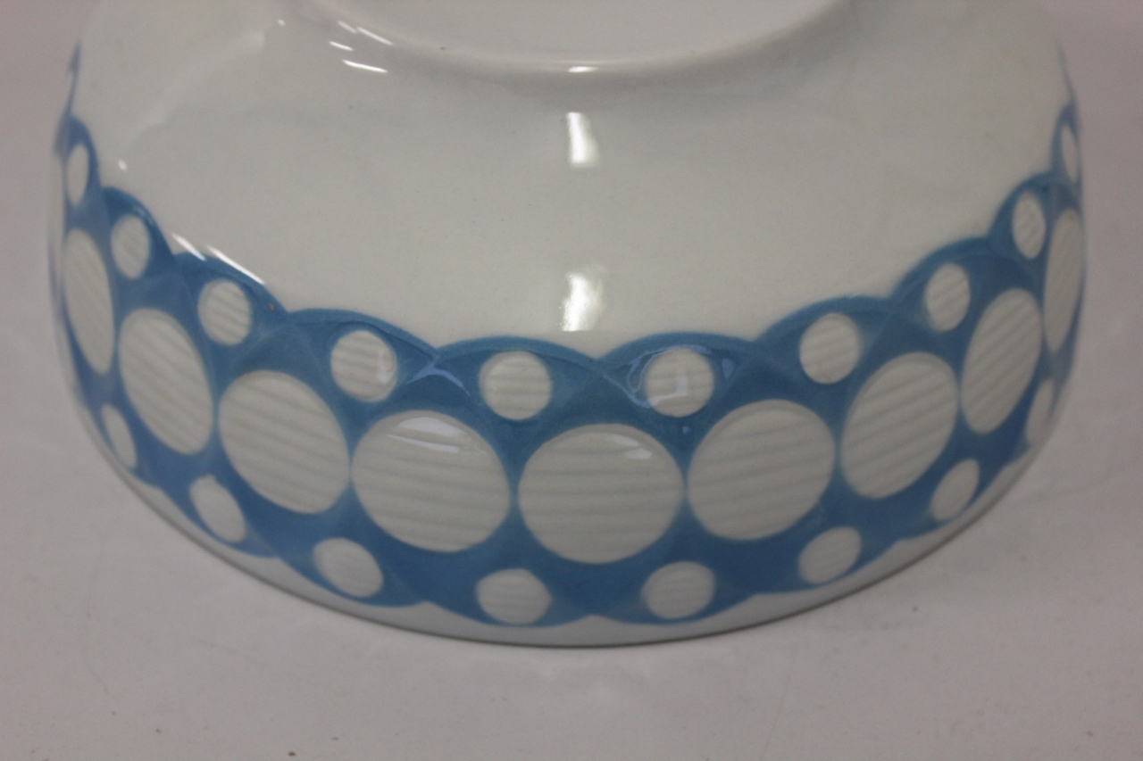 Insalatiera in ceramica dipinta, forma semicilindrica rientrante verso il piede con cui si raccorda. Interno liscio, esterno modellato con fascia composta da elementi circolari entro cui la ceramica è lavorata in rilievo. Fondo bianco, colore azzurro sugli elementi circolari più ampi, usato in modo da creare un effetto ottico