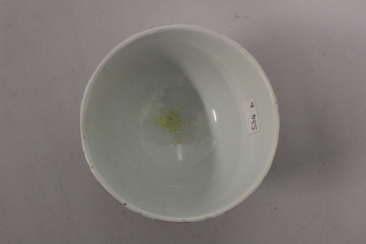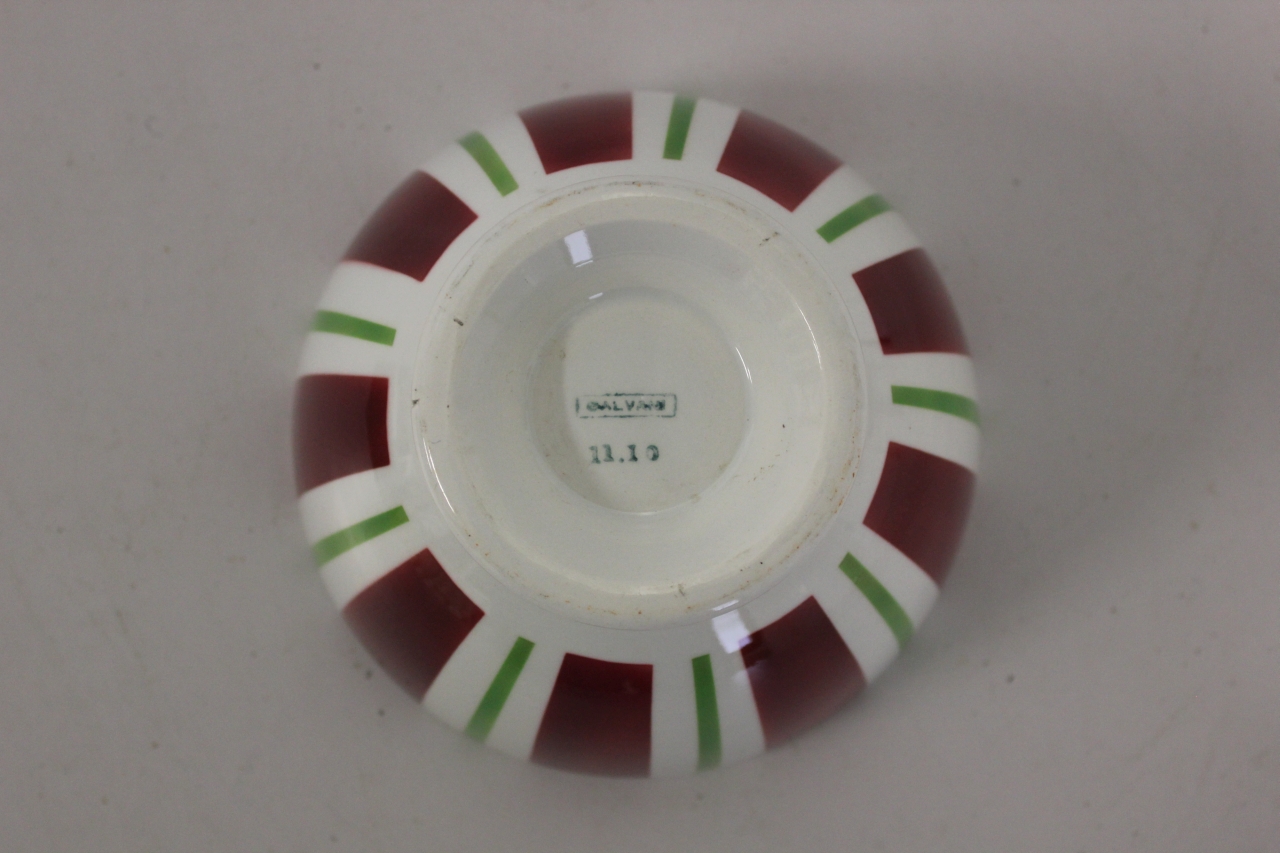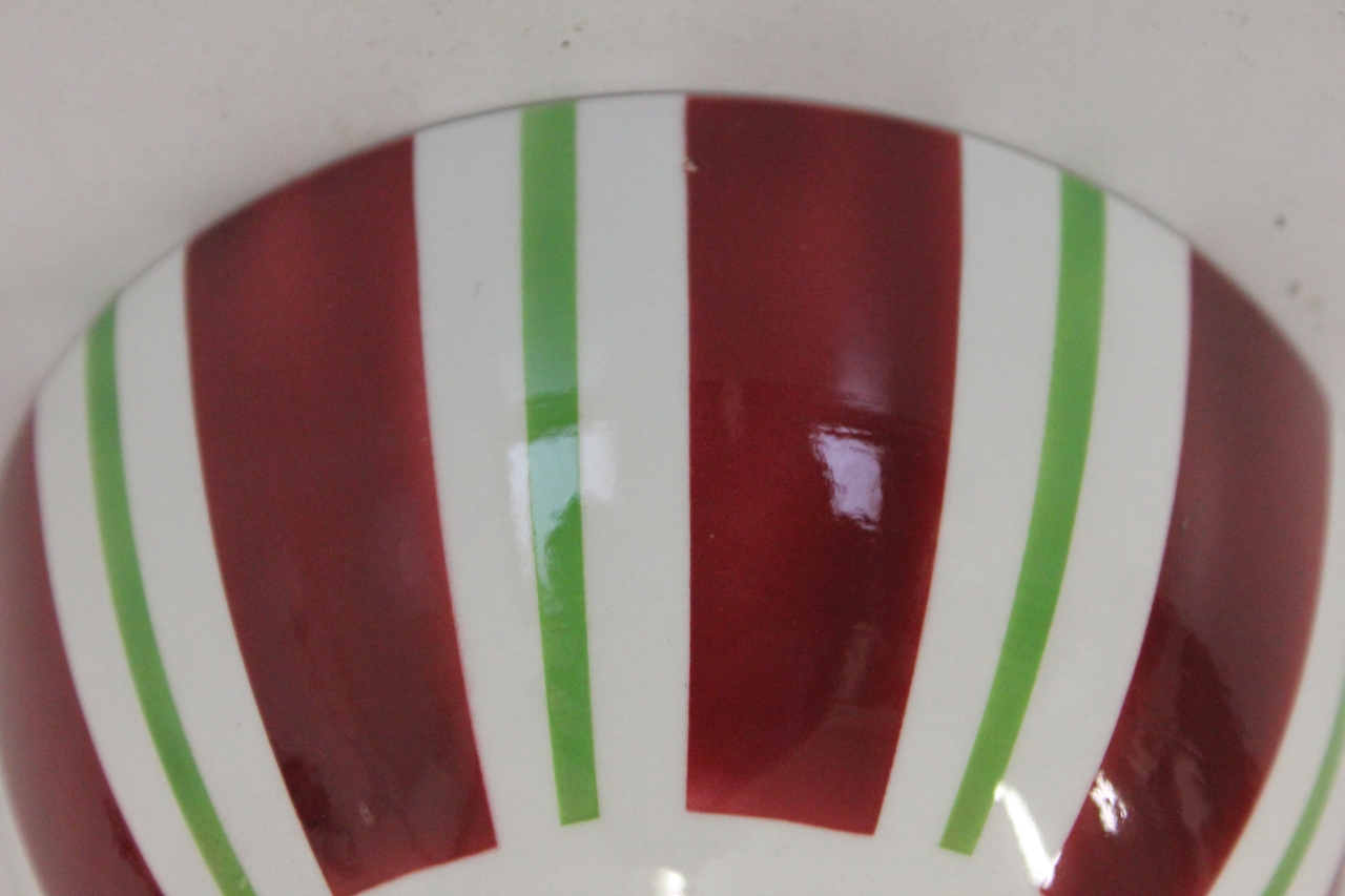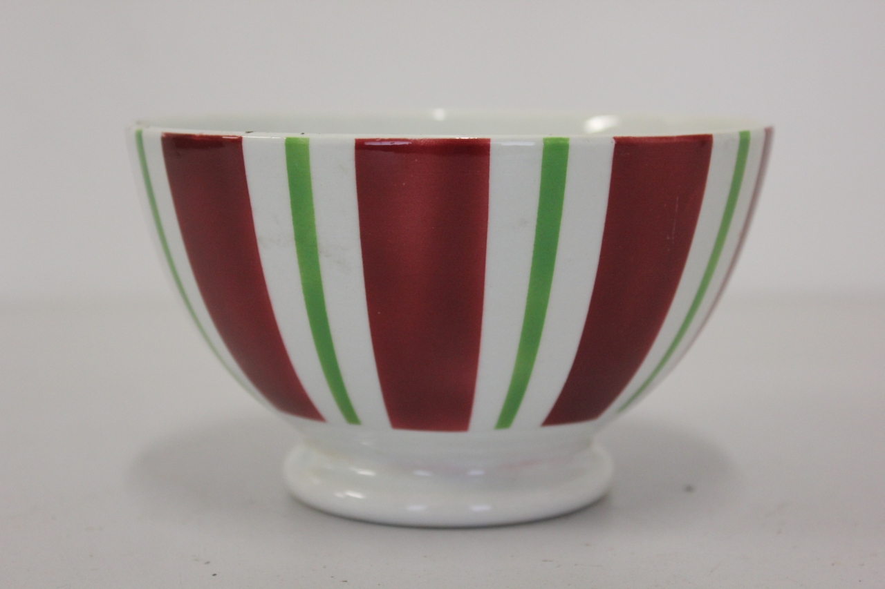 Scodella in ceramica modellata e dipinta, corpo ovale con piede espanso. Fondo bianco e decori a bande verticali concentriche dipinte nei colori rosso bordeaux e verde