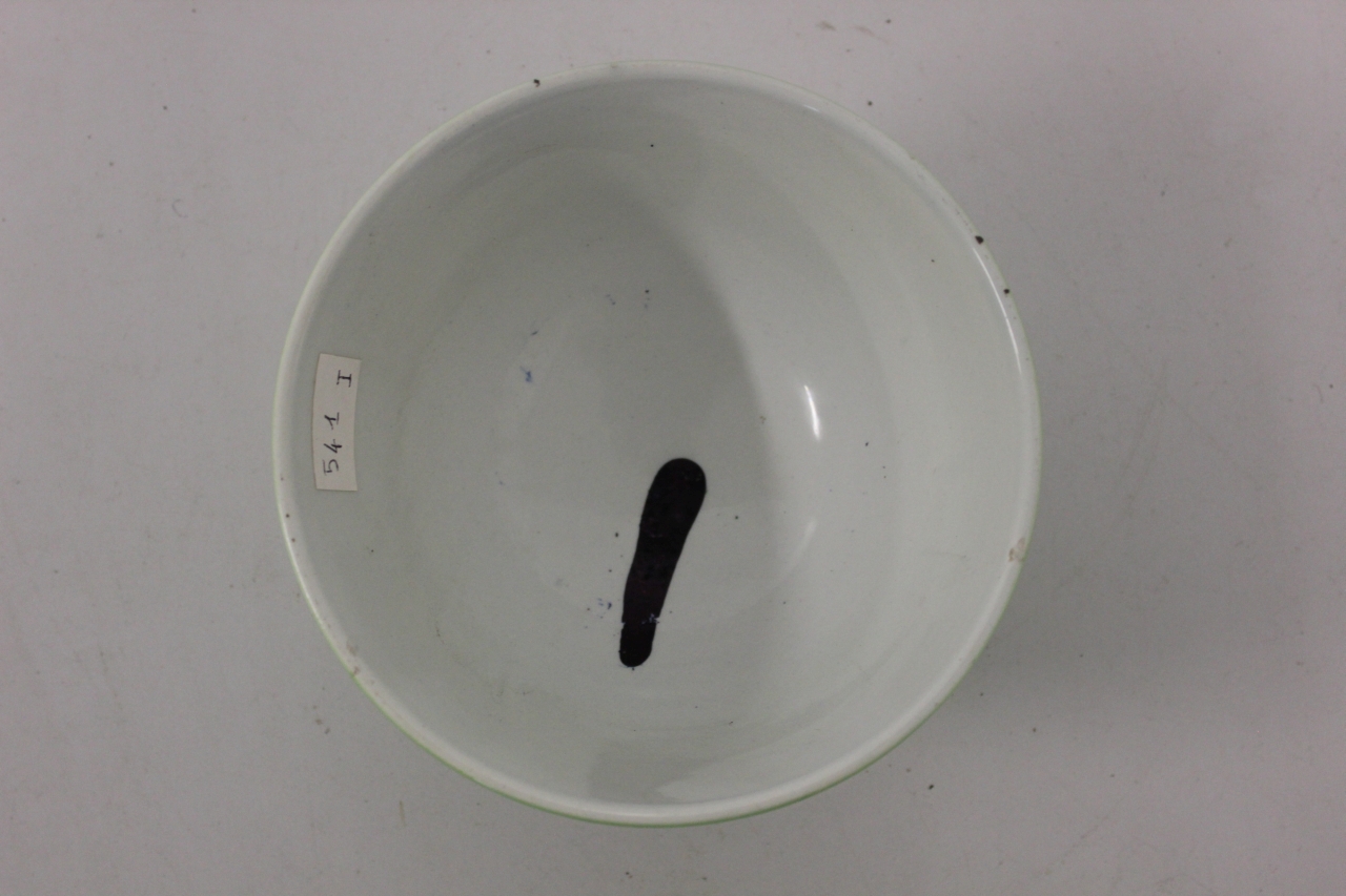 Scodella in ceramica modellata e dipinta, corpo ovale, piede espanso. Fondo bianco modellato a scanalature, decoro a corolle in rilievo dipinte in colore verde, bordo filettato in verde