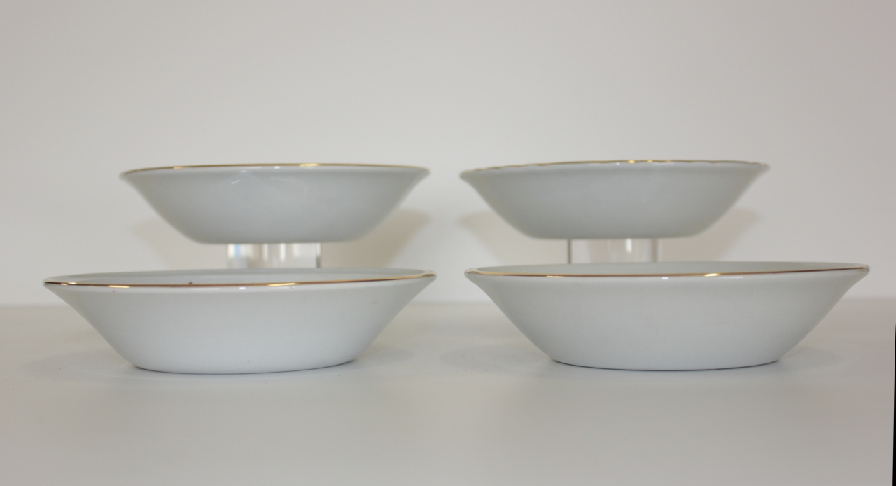 Serie di quattro piatti da dolce (raviera) per campionario, in ceramica modellata e dipinta. Esterno liscio, interno modellato con scanalature e fiori in rilievo (raviera A), ala con scanalature e decoro rocaille in rilievo (raviera B). Fondo bianco, filettatura in oro sul bordo e decoro con motivi floreali a decalcomania