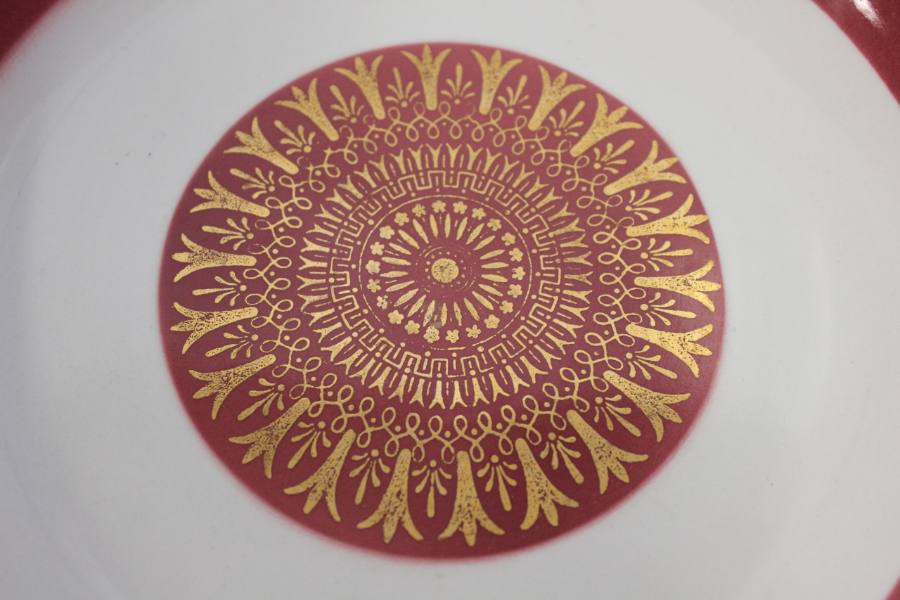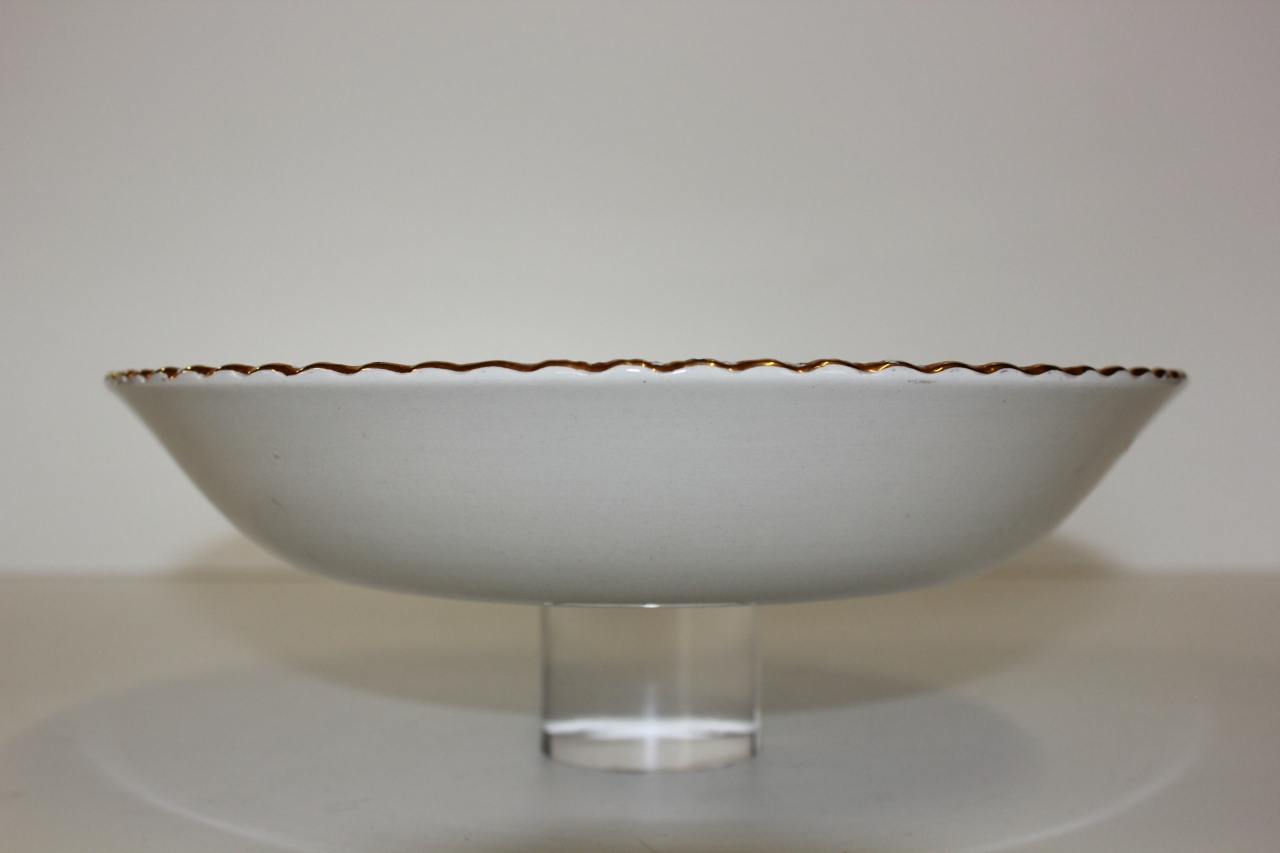 Insalatiera in ceramica modellata e dipinta, corpo a calotta bassa, piede cilindrico, bordo lobato e modellato internamente con zigrinatura a fiamma. Fondo bianco, filetto in oro sul bordo, decoro con fascia in colore rosso e rosone centrale a impressione in oro su fondo rosso