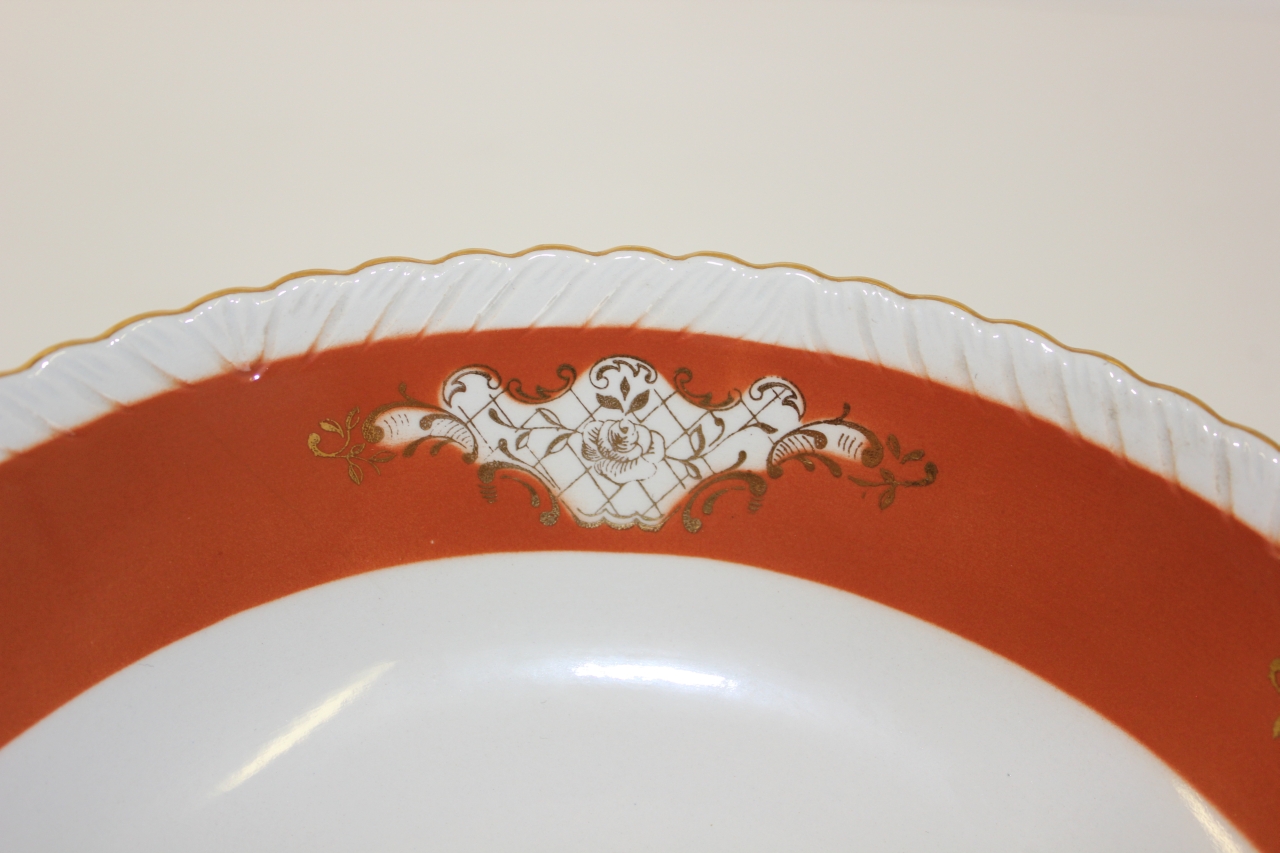 Insalatiera in ceramica modellata e dipinta, corpo a calotta bassa, piede cilindrico, bordo lobato e modellato internamente con zigrinatura a fiamma. Fondo bianco, filetto in oro sul bordo, decoro con fascia in colore terra di Siena con riserve in oro (tipo festone) su fondo bianco