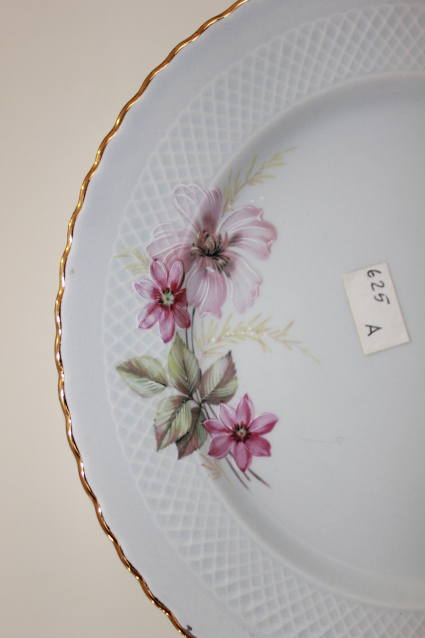 Piatto piano in ceramica modellata e decorata. Bordo lobato, ala con fascia a rete in rilievo. Fondo bianco, ala decorata con due decalcomanie floreali contrapposte, orlo filettato in oro