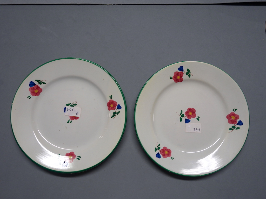 Coppia di piatti da frutta in ceramica decorata e modellata. Orlo liscio dipinto di verde. Ala liscia con tre decorazioni floreali dipinte. Fondo con al centro del cavetto decorazione floreale dipinta